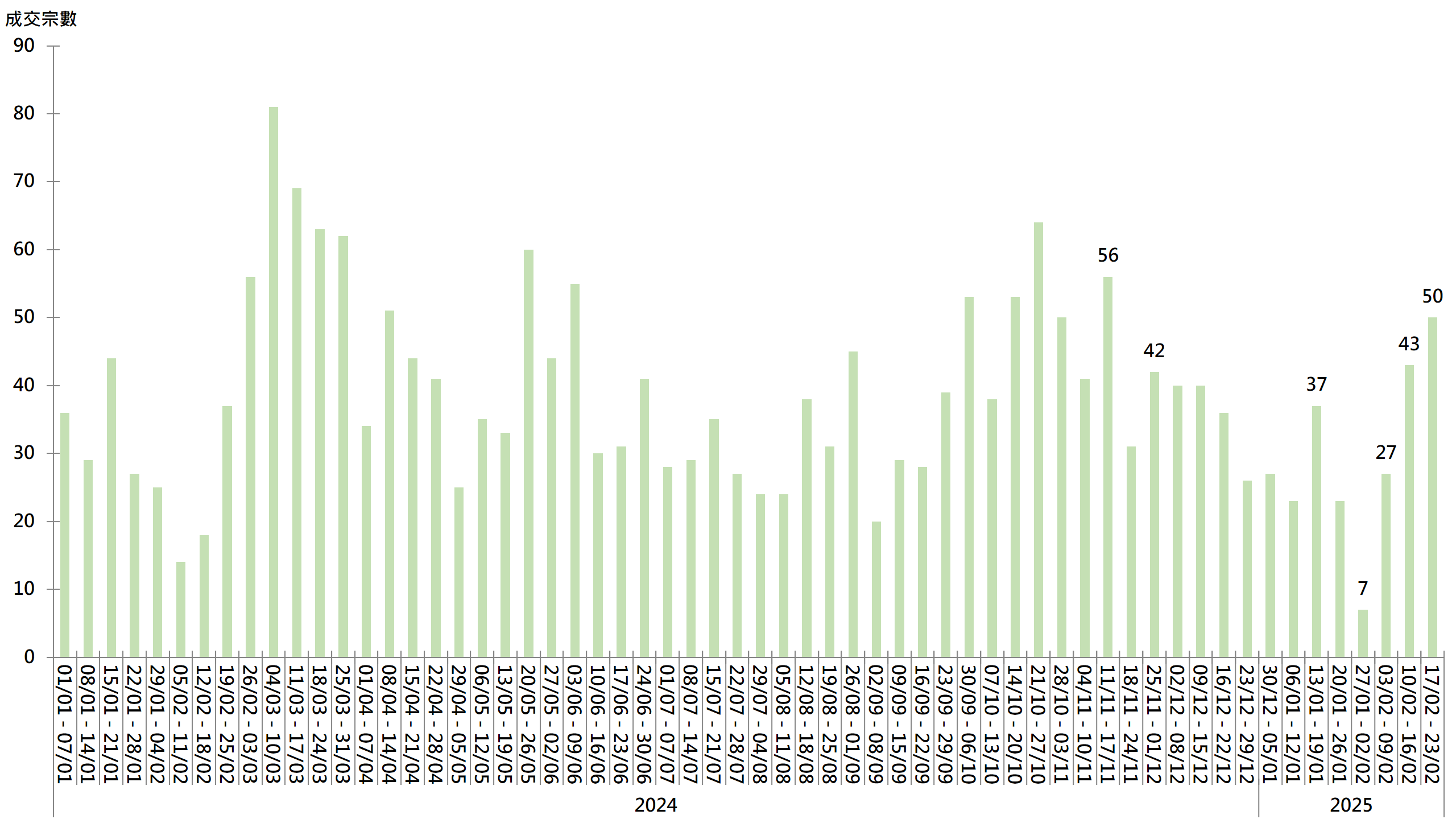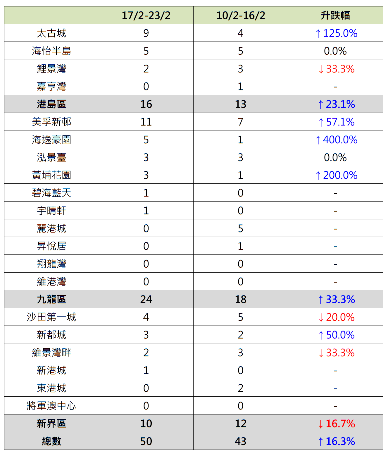據本行前線分行所錄得的數字顯示,綜合過去一星期(2月17日至2月23日)全港20大主要屋苑二手買賣錄50宗成交,較前周(2月10日至2月16日)的43宗增加約16.3%(見圖)。