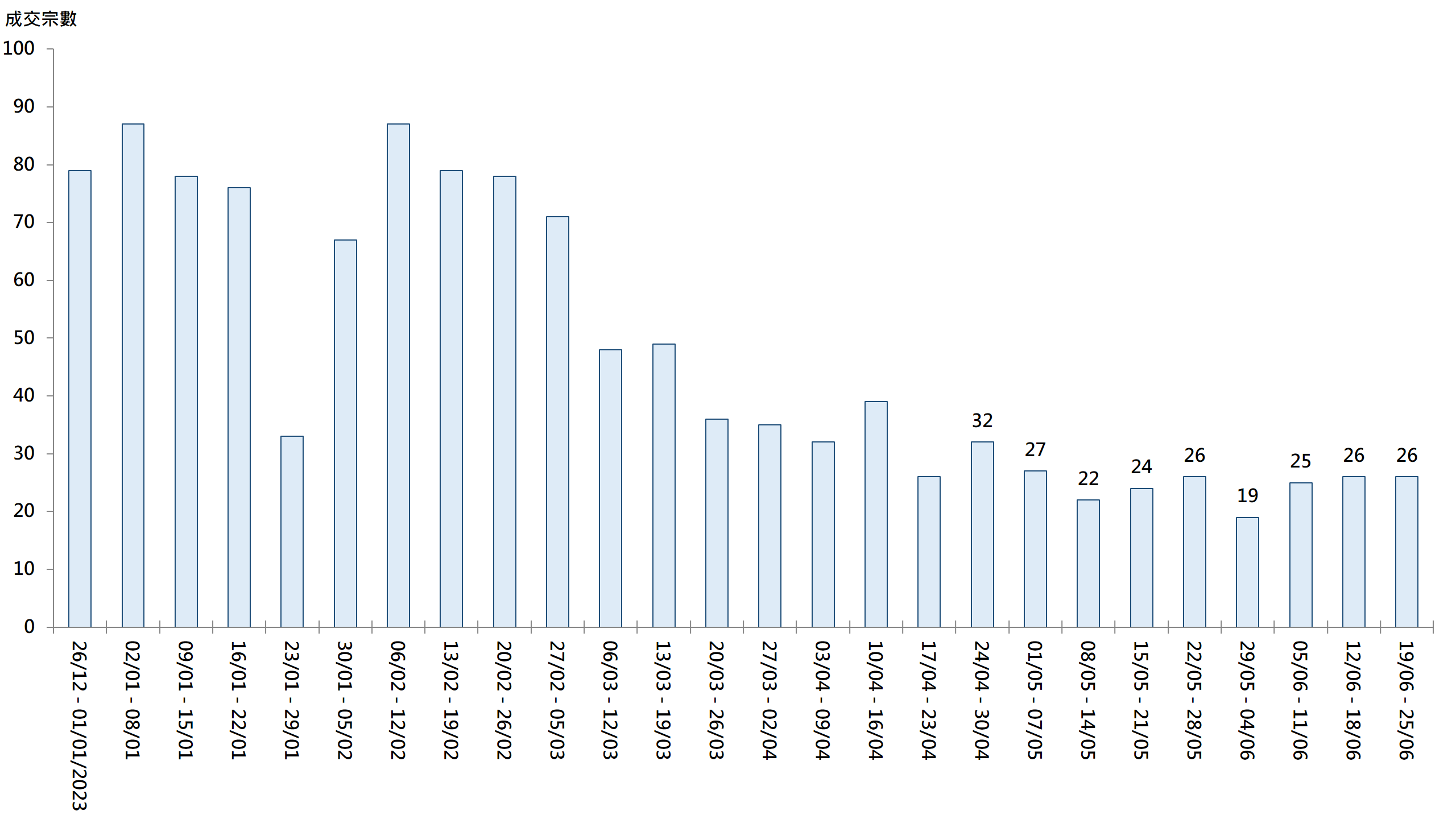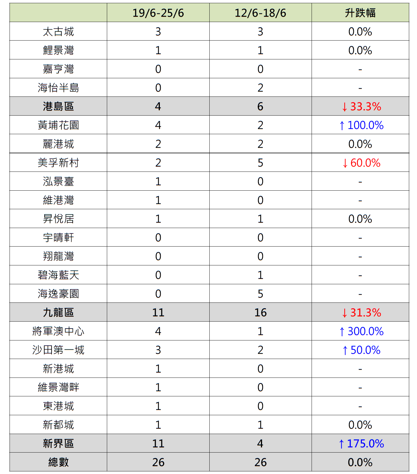 美國聯儲局再次重申年內或加息兩次,不利樓市氣氛,二手交投持續低迷;據本行前線分行所錄得的數字顯示,綜合過去一星期(6月19日至6月25日)全港20大主要屋苑二手買賣錄26宗成交,按周持平(見圖)。