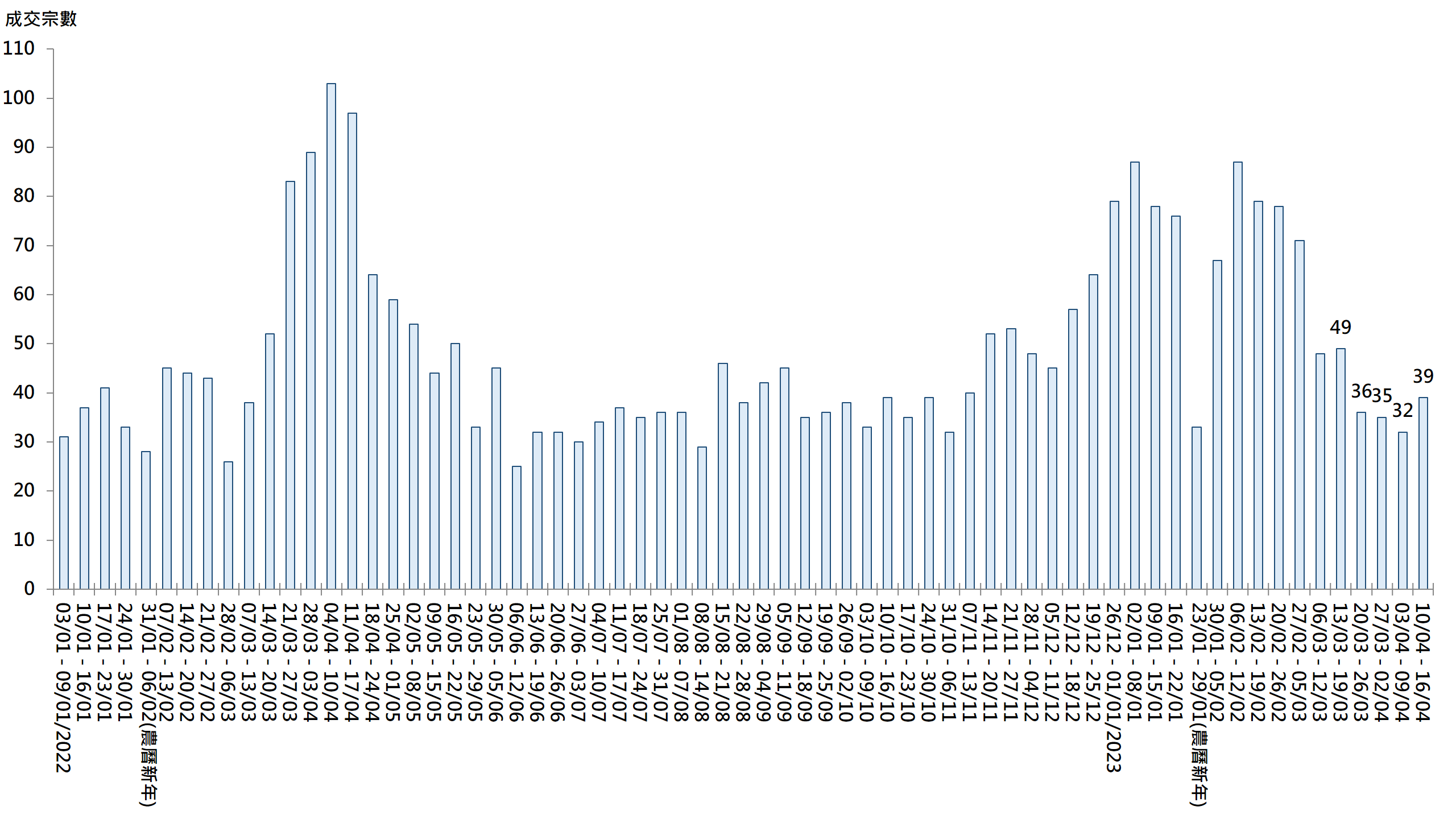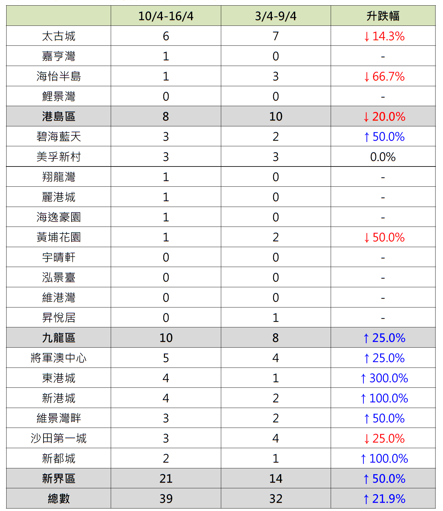 據本行前線分行所錄得的數字顯示,綜合過去一星期(4月10日至4月16日)全港20大主要屋苑二手買賣錄39宗成交,較前周(4月3日至4月9日)的32宗增加約21.9%(見圖)。