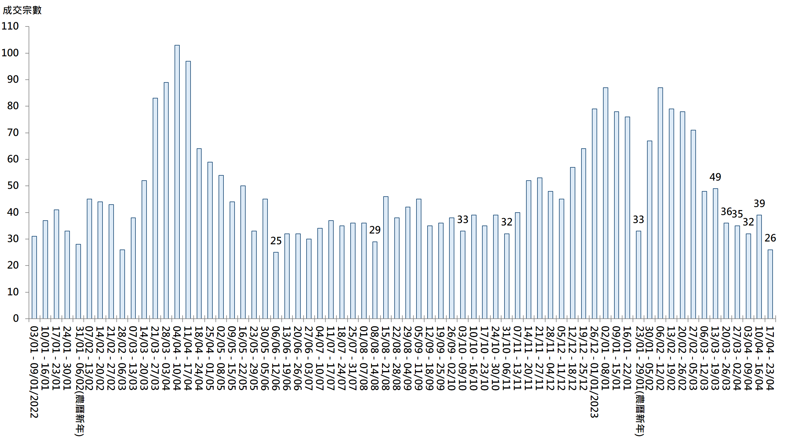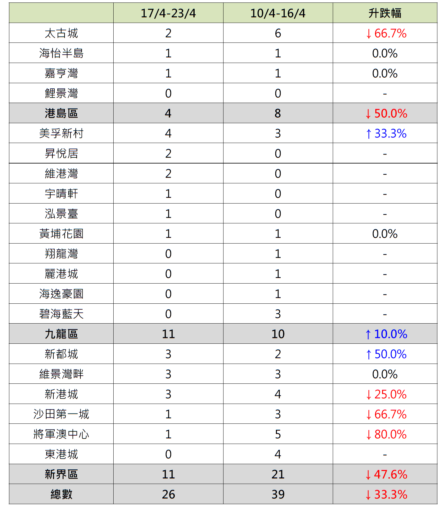 全新盤推售消息不斷,凍結二手購買力,二手交投放緩;據本行前線分行所錄得的數字顯示,綜合過去一星期(4月17日至4月23日)全港20大主要屋苑二手買賣錄26宗成交,較前周(4月10日至4月16日)的39宗減少約33.3%(見圖)。
