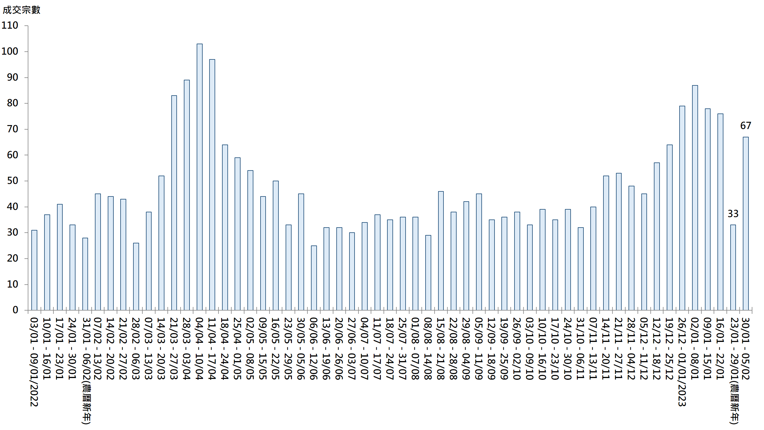 據本行前線分行所錄得的數字顯示,綜合過去一星期(1月30日至2月5日)全港20大主要屋苑二手買賣錄67宗成交,較前周(1月23日至1月29日)的33宗大增逾1倍(見圖);增幅顯著,相信與中港兩地全面恢復通關,再加上本港銀行上周未有跟隨美國加息,利好樓市氣氛,以及前周新春假期「基數低」有關。