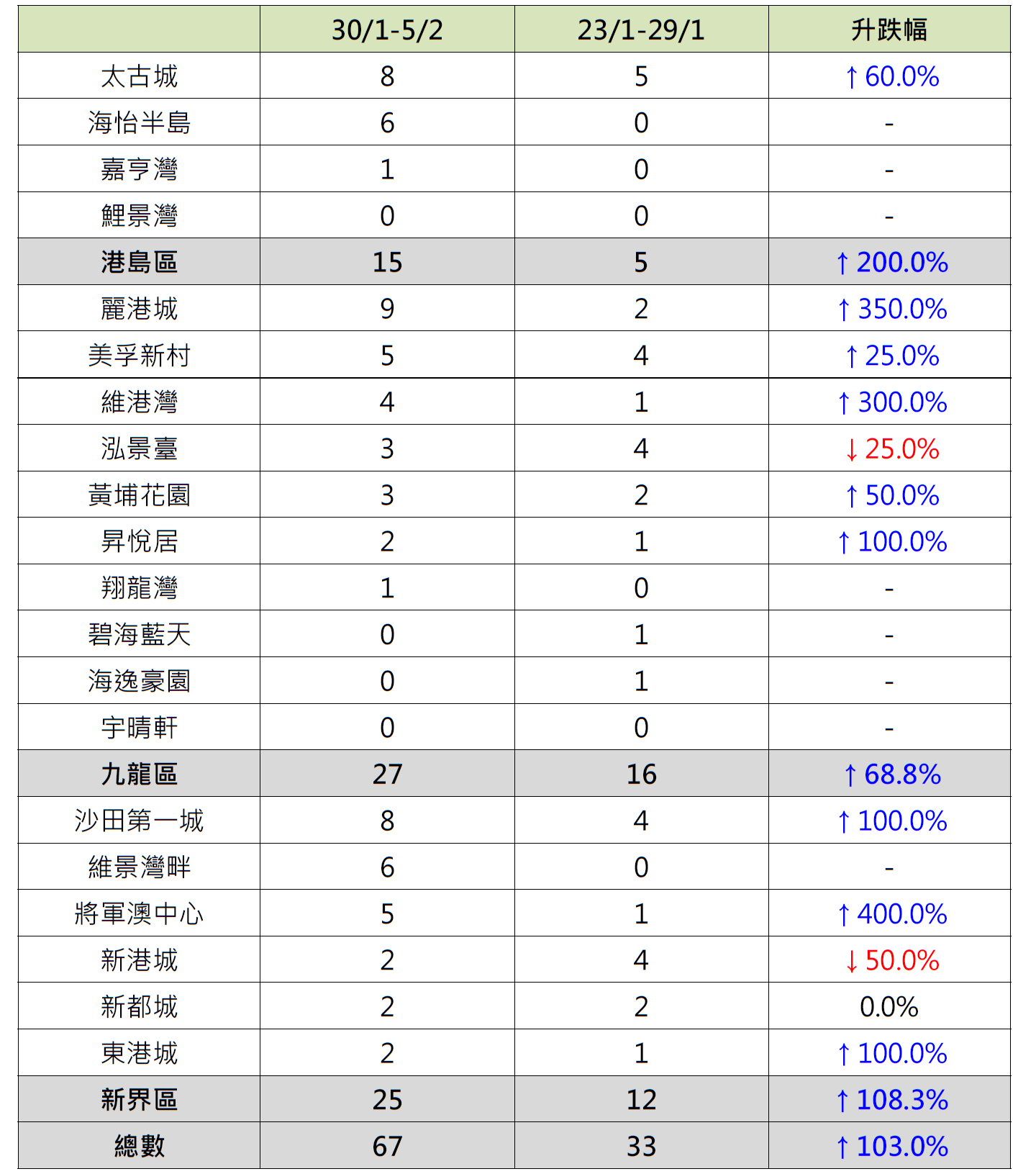 而九龍區10個指標屋苑上周錄27宗成交,按周增加約68.8%;當中美孚新村錄5宗成交,按周增加25%;黃埔花園3宗成交,按周增加50%;昇悅居錄2宗成交,按周增加1倍;維港灣錄4宗成交,按周增加3倍;麗港城錄9宗成交,按周增加3.5倍;翔龍灣「破蛋」,按周增加1宗成交;相反,泓景臺錄3宗成交,按周減少25%;碧海藍天及海逸豪園由前周各錄1宗成交齊減少至上周「零成交」。