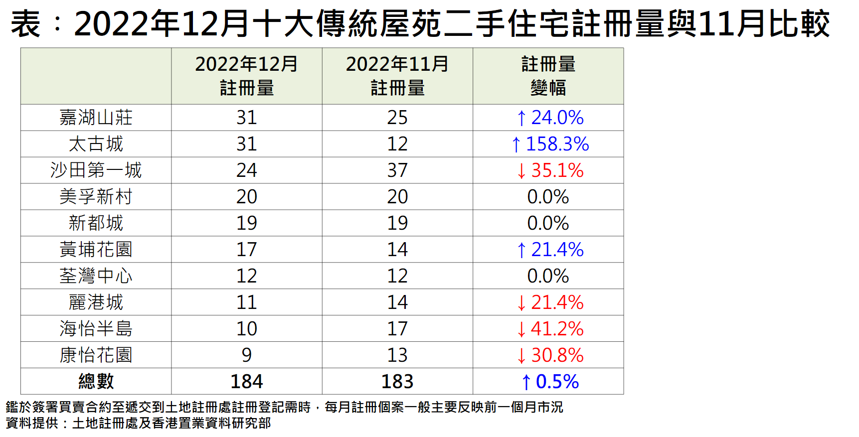據土地註冊處資料顯示,十大傳統屋苑2022年12月錄184宗二手住宅註冊,較11月的183宗增加約0.5%(見圖)。鑑於簽署買賣合約至遞交到土地註冊處註冊登記需時,2022年12月註冊個案一般主要反映11月市況。