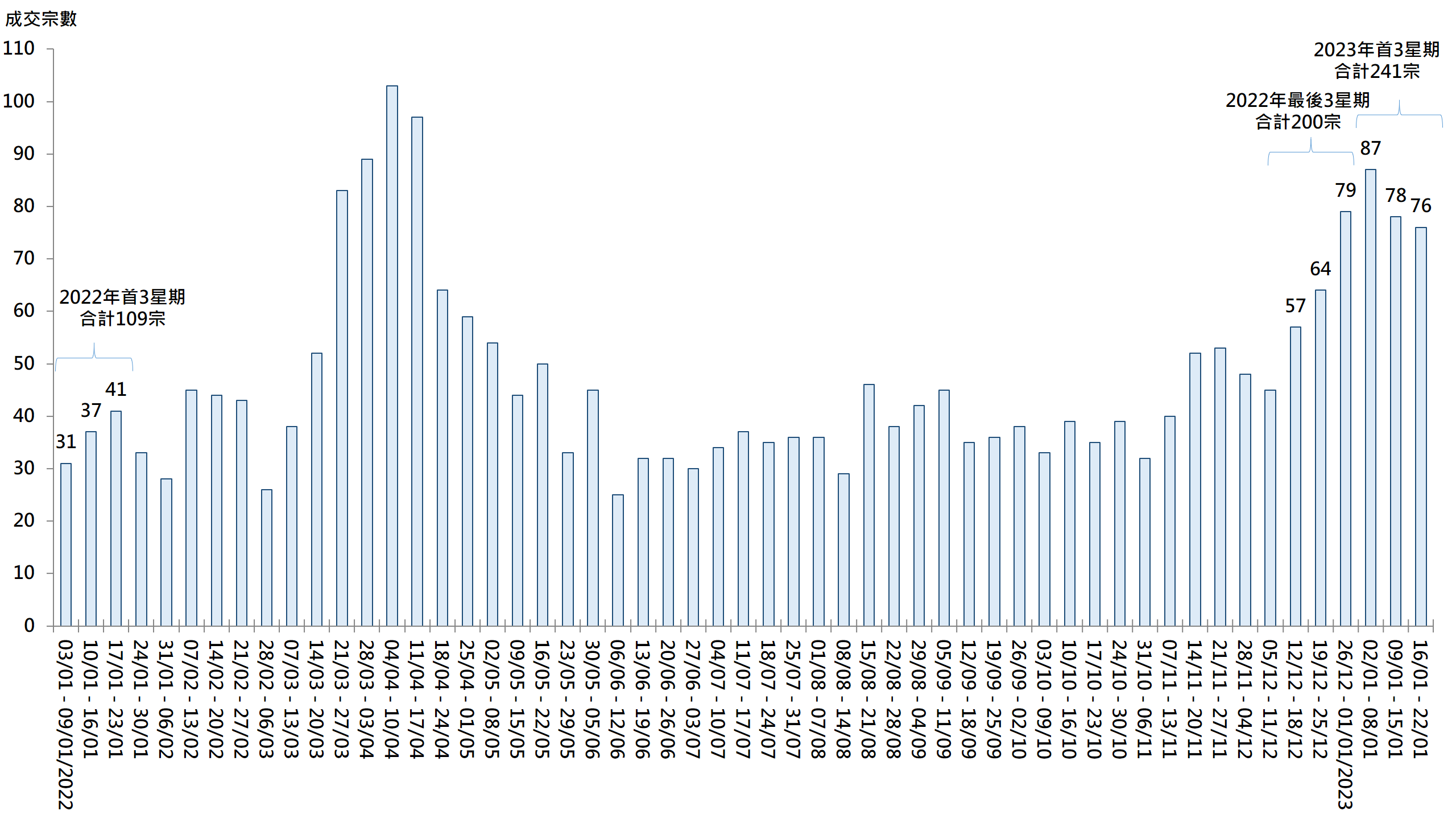 在種種利好因素下,樓市交投轉趨熾熱;據本行前線分行所錄得的數字顯示,綜合今年首3星期(1月2日至1月22日)全港20大主要屋苑二手買賣共錄241宗成交,較前3星期(2022年12月12日至2023年1月1日)的200宗增加20.5%,若與去年首3星期(2022年1月3日至1月9日)的109宗更大增逾1.2倍(見圖二),亦是自2013年後表現最好的首3星期(見表)。