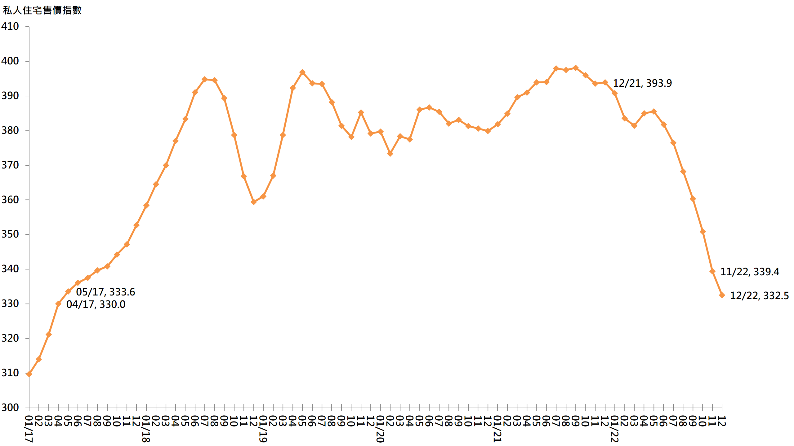 今日差估署公佈私人住宅售價指數,12月為332.5點,按月減少約2%,連跌7個月,創自2017年4月後逾5年半新低;而2022年全年私人住宅售價指數則跌約15.6%(見圖一)。