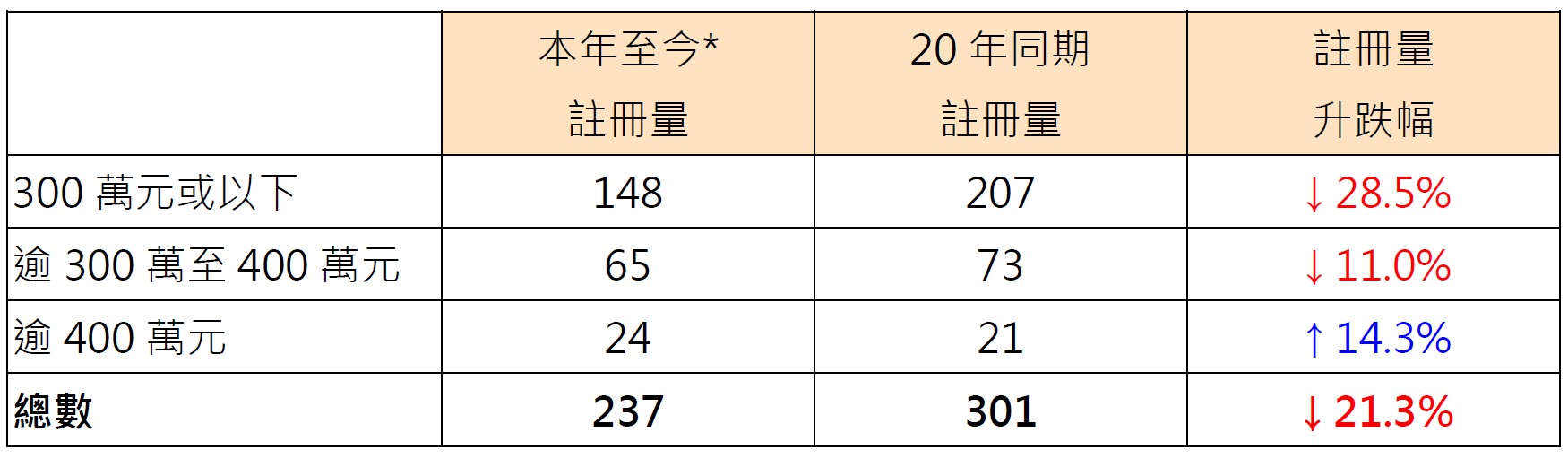 表︰按金額劃分本年至今*二手公屋註冊量與20年同期比較