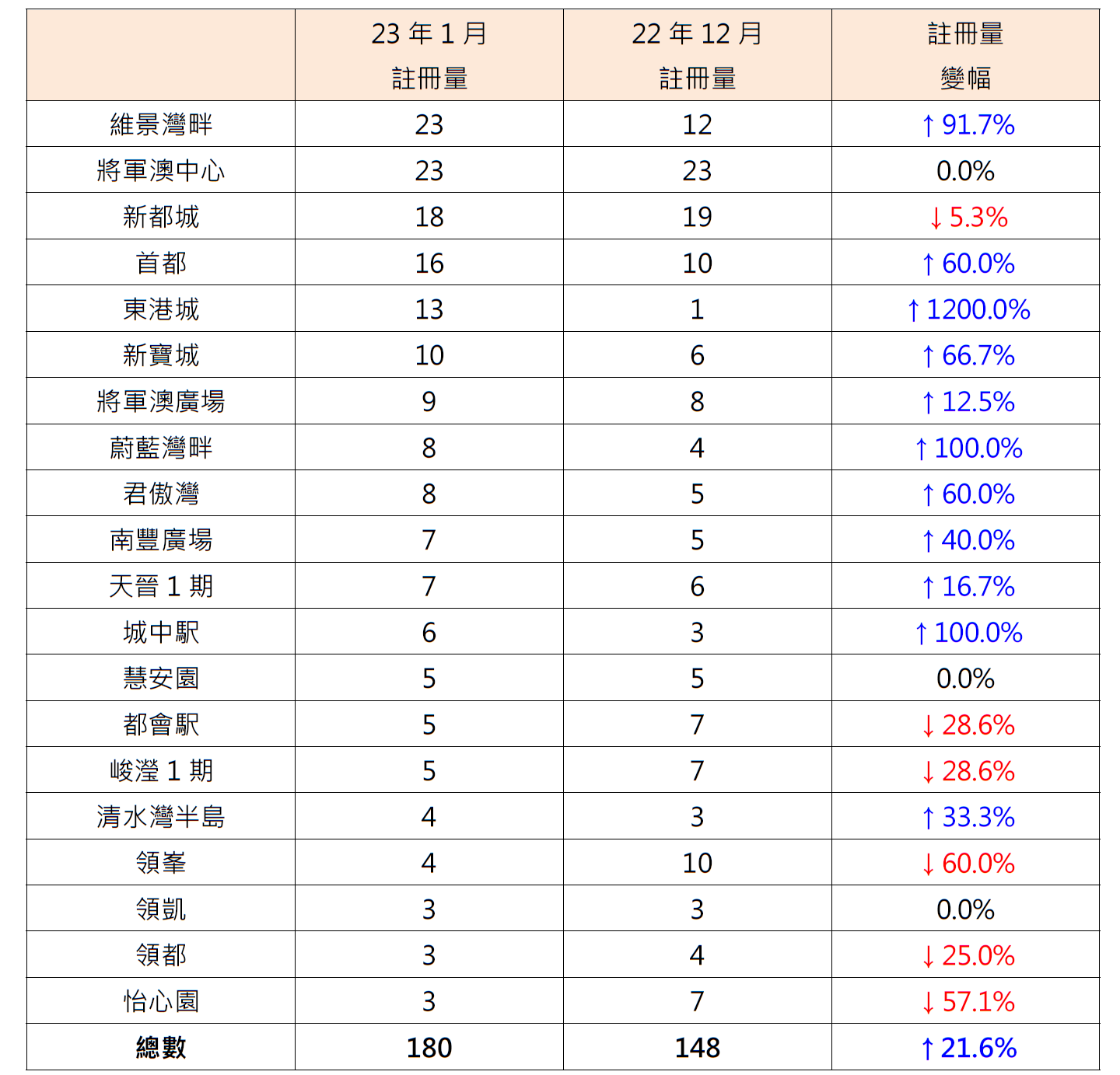 將軍澳區20個私人屋苑中,11個屋苑二手住宅註冊量按月報升,6個屋苑報跌,3個屋苑持平;報升屋苑中,東港城錄13宗註冊,較去年12月的1宗增加12倍;蔚藍灣畔錄8宗註冊,較去年12月的4宗增加1倍;城中駅錄6宗註冊,較去年12月的3宗同樣增加1倍。