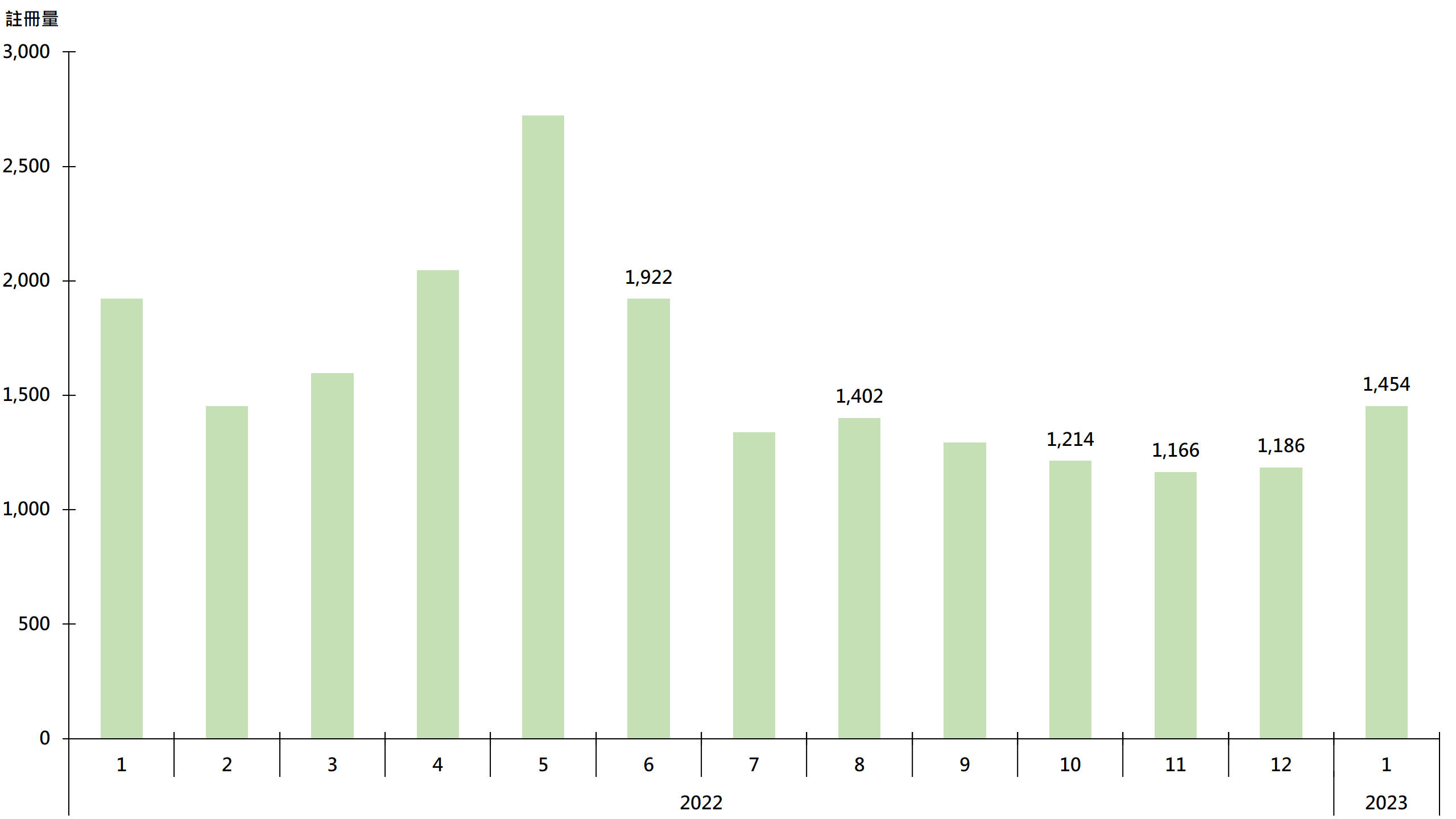 據土地註冊處最新資料顯示,1月錄1,454宗逾500萬至1,000萬元二手住宅註冊,較去年12月的1,186宗增加約22.6%,創近7個月新高(見圖)。鑑於簽署買賣合約至遞交到土地註冊處註冊登記需時,今年1月註冊個案一般主要反映去年12月市況。