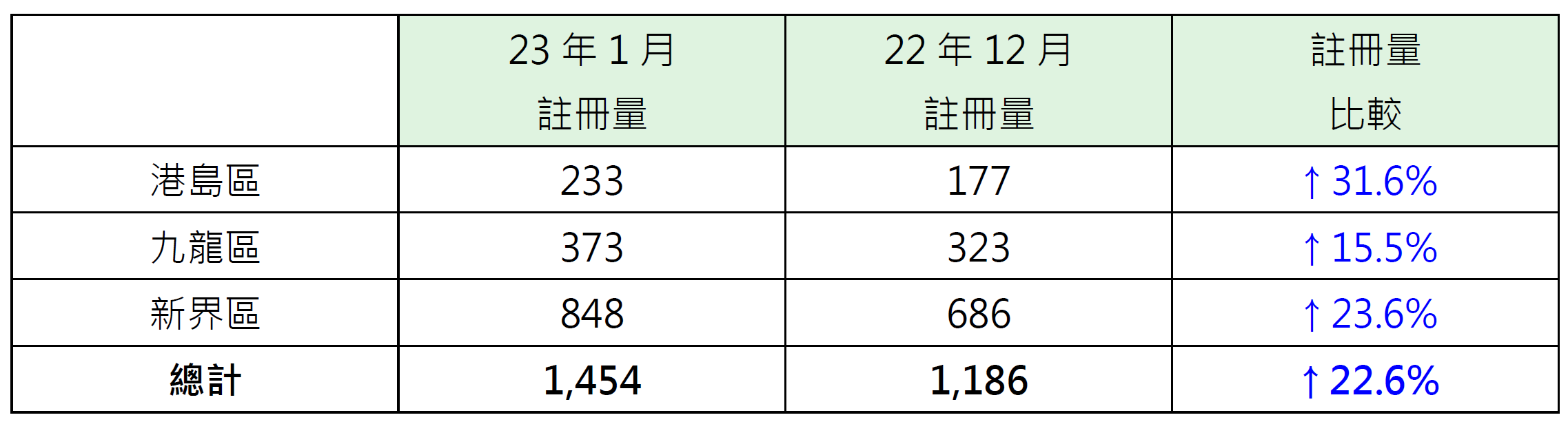 若以港島、九龍及新界三區劃分1月逾500萬至1,000萬元二手住宅註冊量表現,其中港島區錄233宗註冊,較去年12月的177宗增加約31.6%;新界區錄848宗註冊,較去年12月的686宗增加約23.6%;九龍區錄373宗註冊,較去年12月的323宗增加約15.5%(見表)。