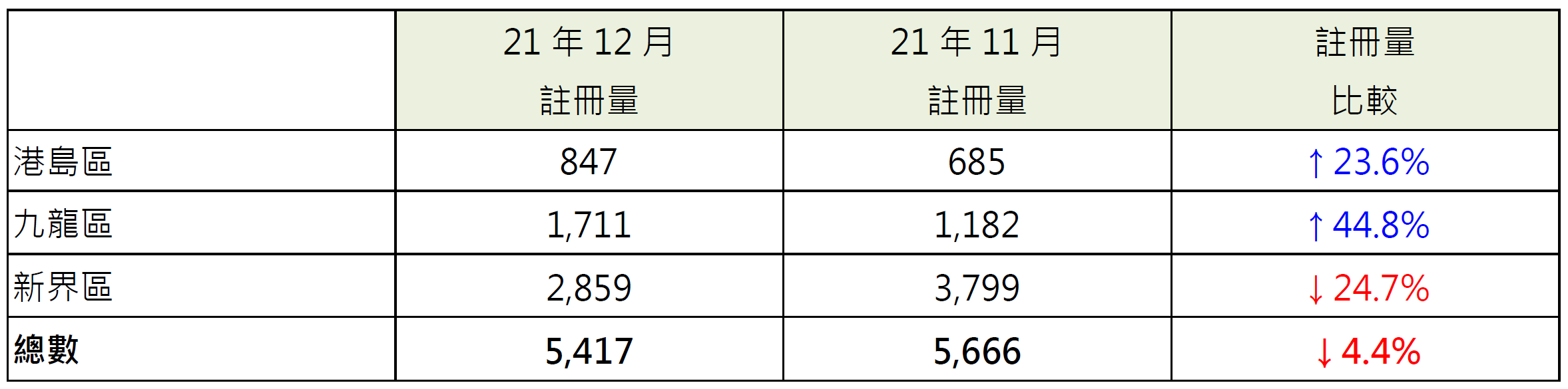 表:21年12月各區整體住宅物業註冊量與21年11月比較
