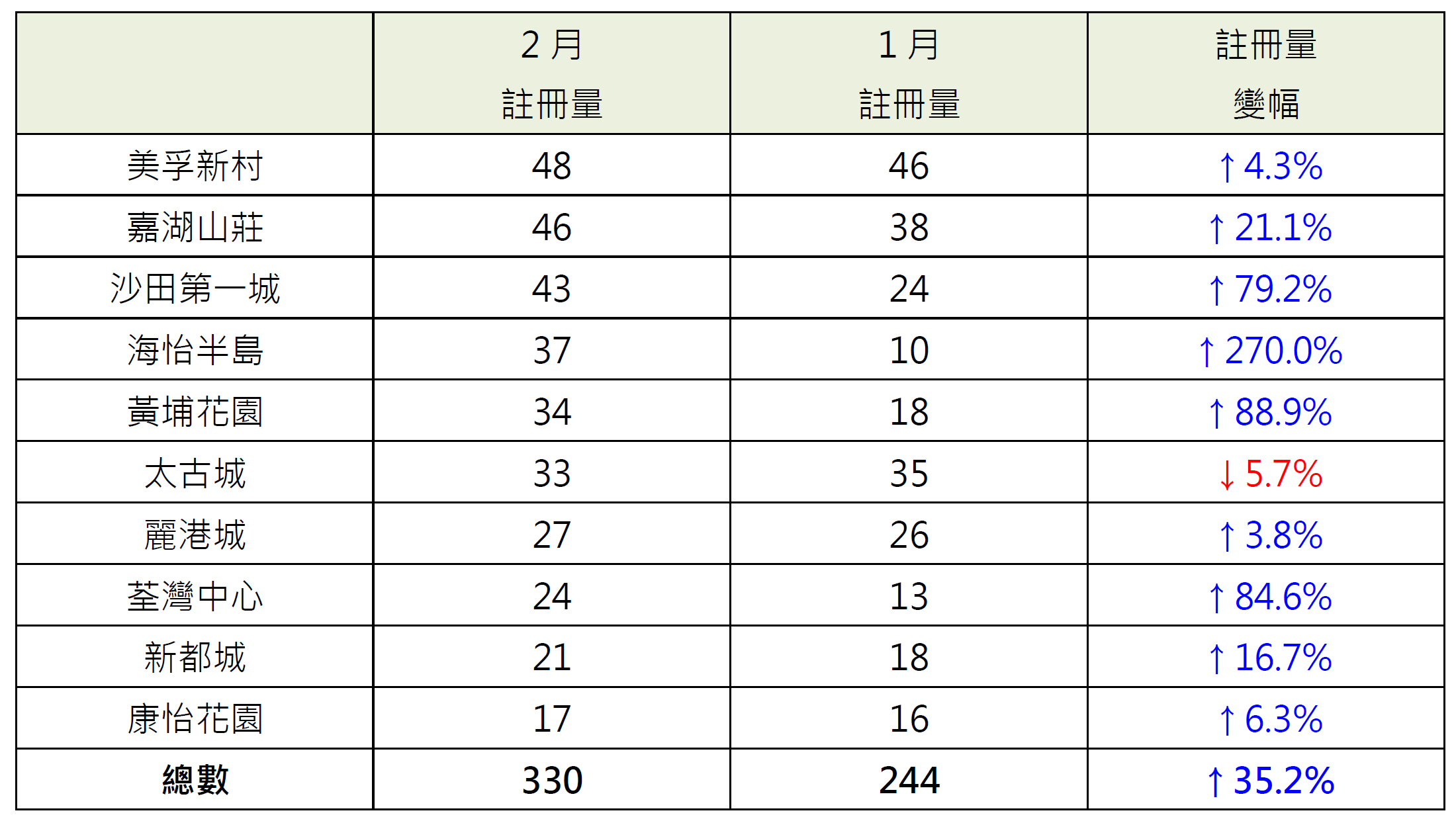 十大傳統屋苑中,有9個屋苑按月報升,1個屋苑報跌;報升屋苑中,海怡半島錄37宗註冊,較1月的10宗增加2.7倍;黃埔花園錄34宗註冊,較1月的18宗增加約88.9%;荃灣中心錄24宗註冊,較1月的13宗增加約84.6%。