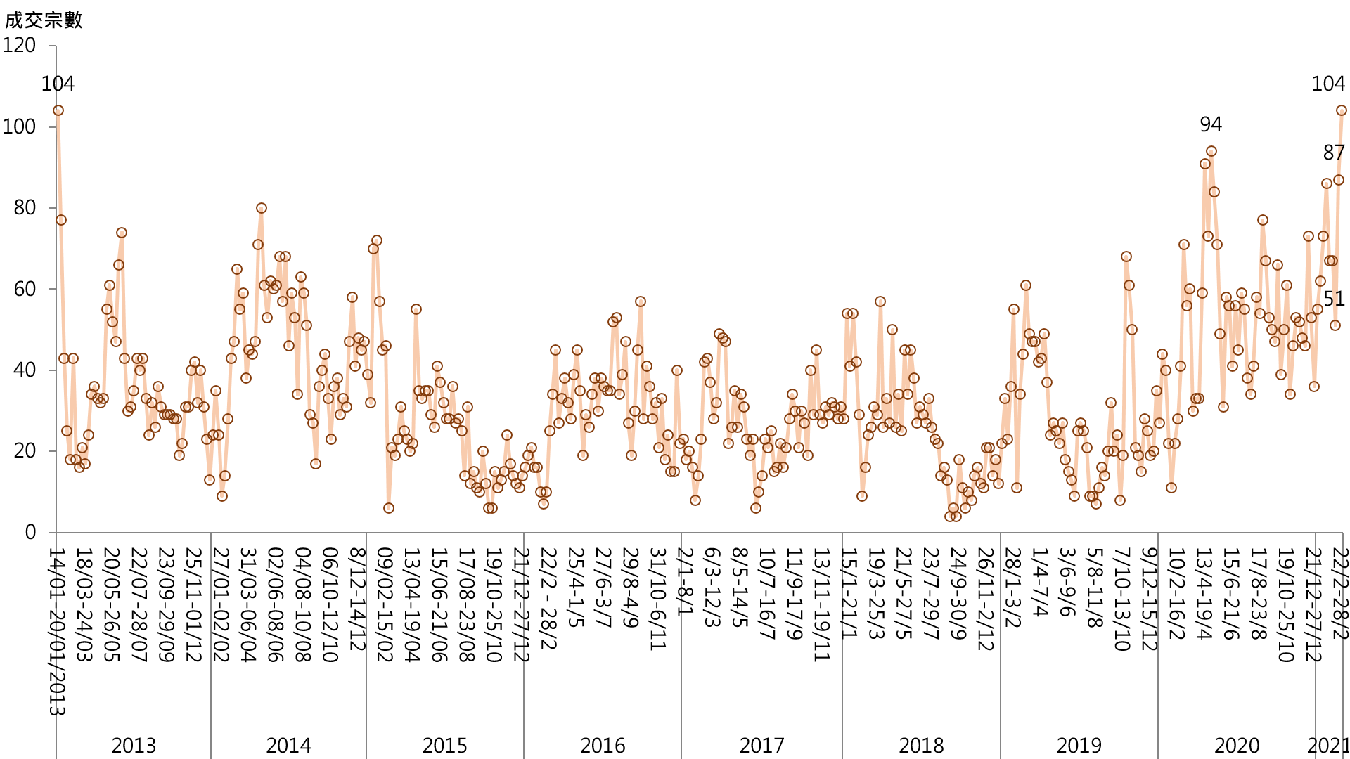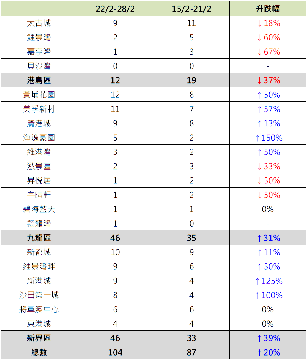 雖然過去周末部分二手指標屋苑交投回落,但綜合一周數據,二手交投表現則亮麗。據本行前線分行所錄得的數字顯示,綜合過去一星期(2月22日至2月28日)全港20大主要屋苑二手買賣錄104宗成交,較前周(2月15日至2月21日)的87宗增加約20%,連升兩周,並相隔8年再錄逾100宗水平(見圖)。