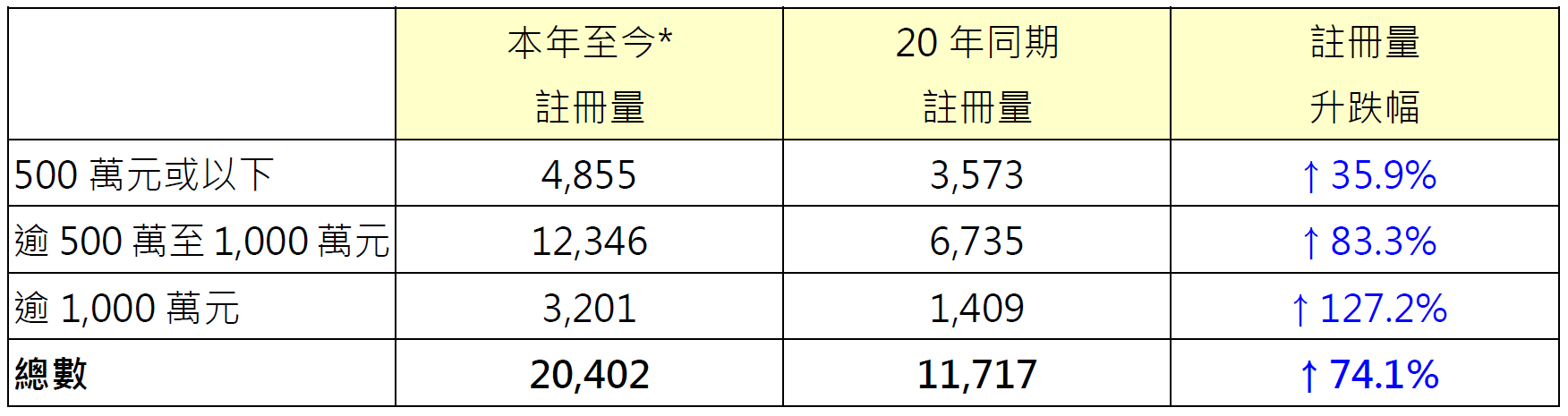 表:按金額劃分本年至今*二手住宅註冊量與20年同期數字比較