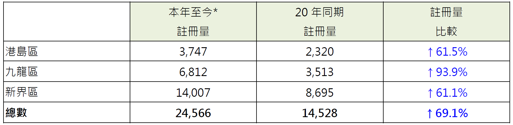 表:本年至今*各區整體住宅物業註冊量與20年同期數字比較