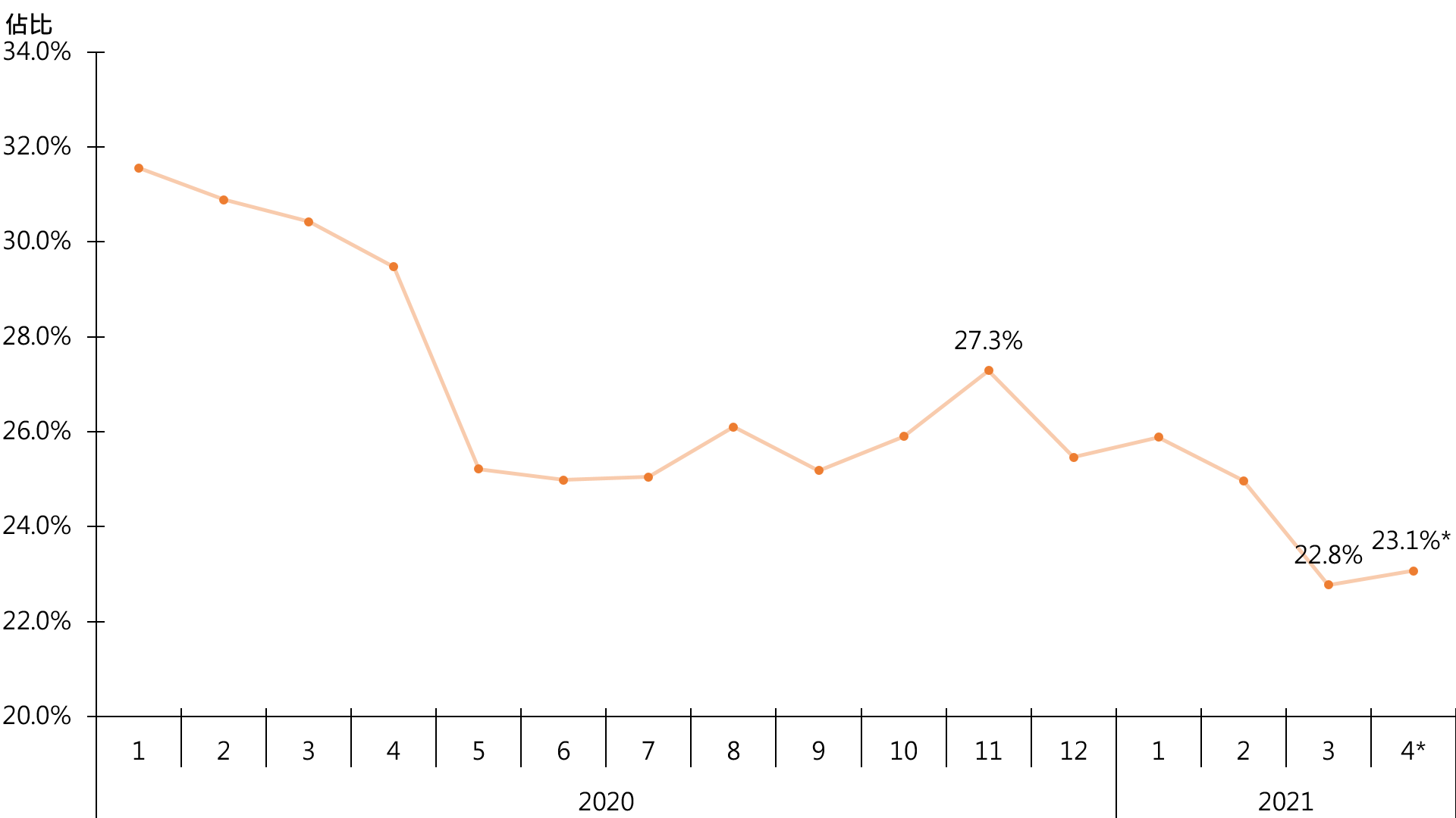 另外,500萬元或以下二手住宅物業佔整體二手住宅物業註冊量暫錄約23.1%,較3月全月約22.8%高出約0.3個百分點(見圖)。
