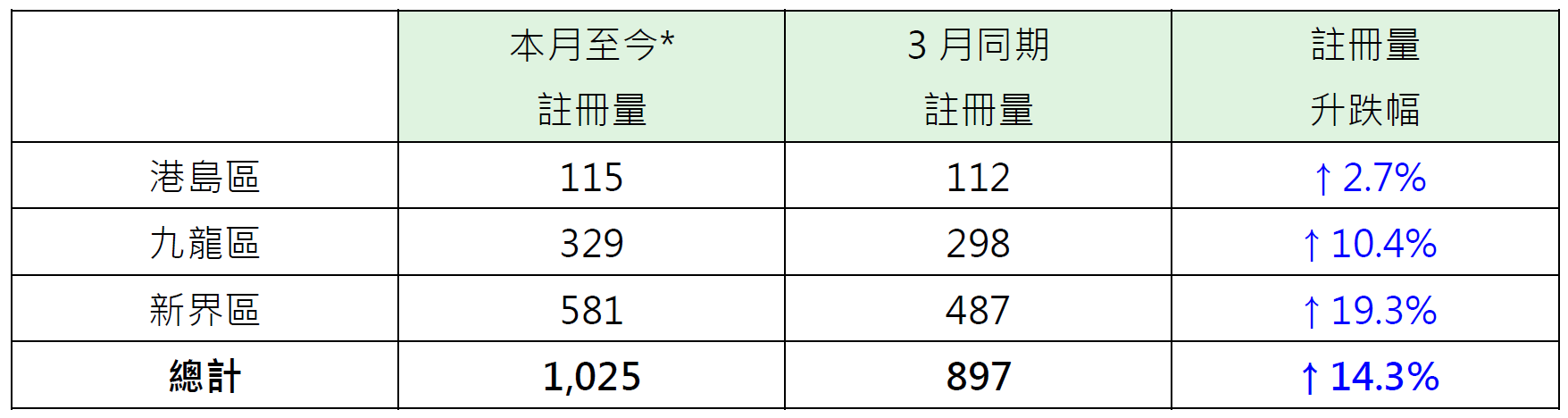 若以港島、九龍及新界三區劃分本月至今500萬元或以下二手住宅物業註冊表現,其中港島區錄115宗註冊,較3月同期的112宗增加約2.7%;九龍區錄329宗註冊,較3月同期的298宗增加約10.4%;新界區錄581宗註冊,較3月同期的487宗增加約19.3%(見表)。