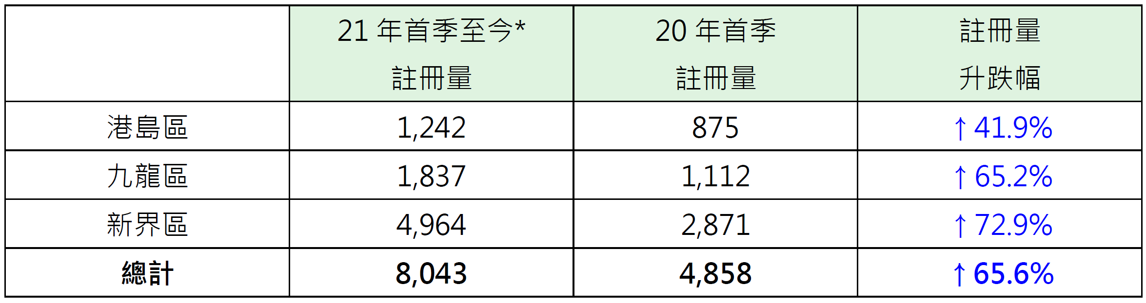 表:21年首季至今*三區逾500萬至1,000萬元二手住宅註冊量與20年首季比較