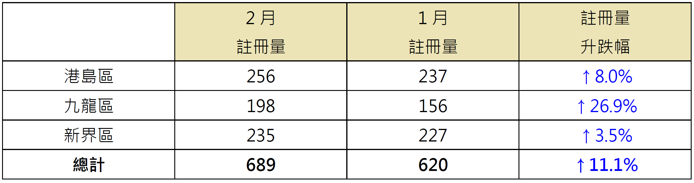 若以港島、九龍及新界三區劃分2月逾千萬元二手住宅註冊量表現,其中港島區錄256宗註冊,較1月的237宗增加約8%;九龍區錄198宗註冊,較1月的156宗增加約26.9%;新界區錄235宗註冊,較1月的227宗增加約3.5%(見表)。