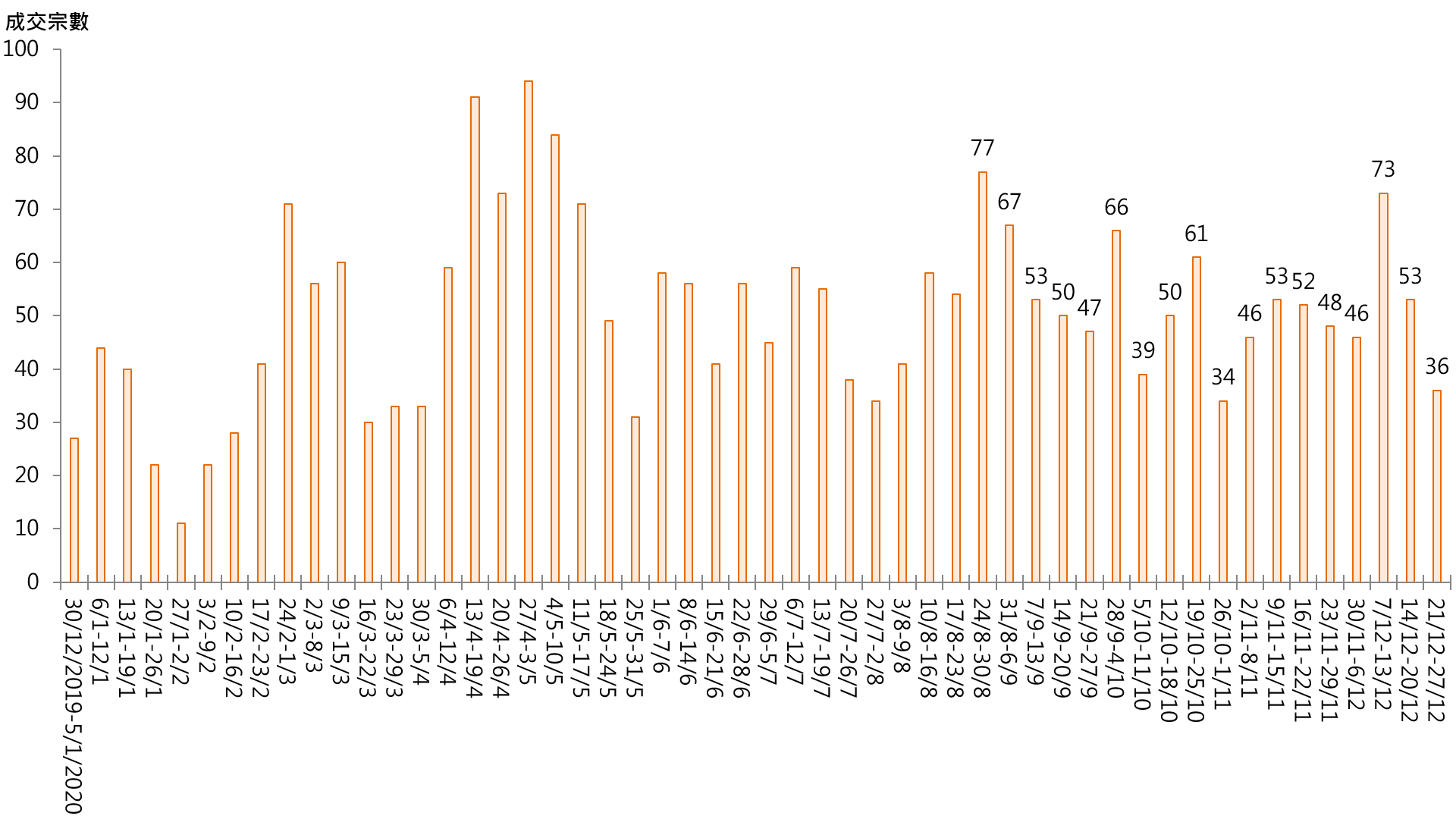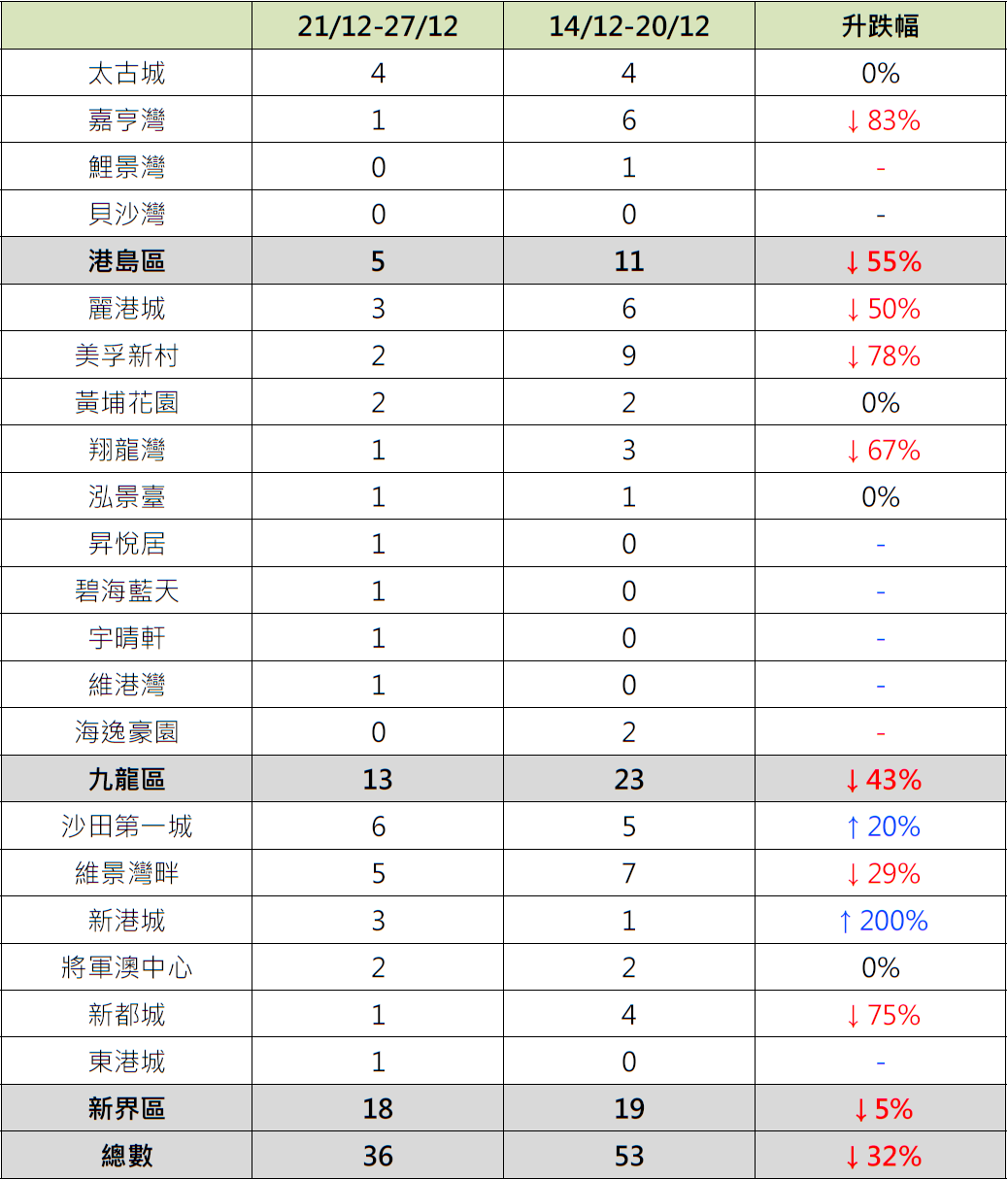 據本行前線分行所錄得的數字顯示,綜合過去一星期(12月21日至12月27日)全港20大主要屋苑二手買賣錄36宗成交,較前周(12月14日至12月20日)的53宗減少約32%(見圖)。