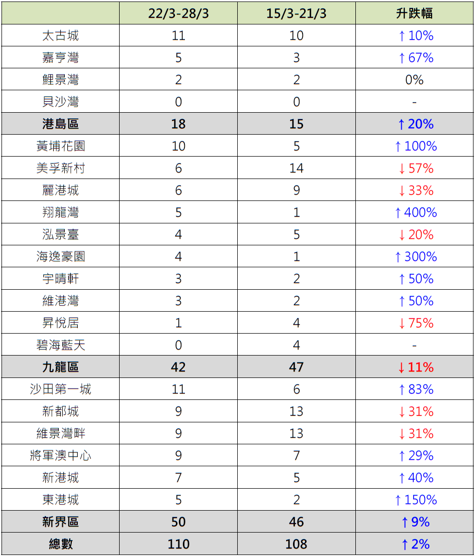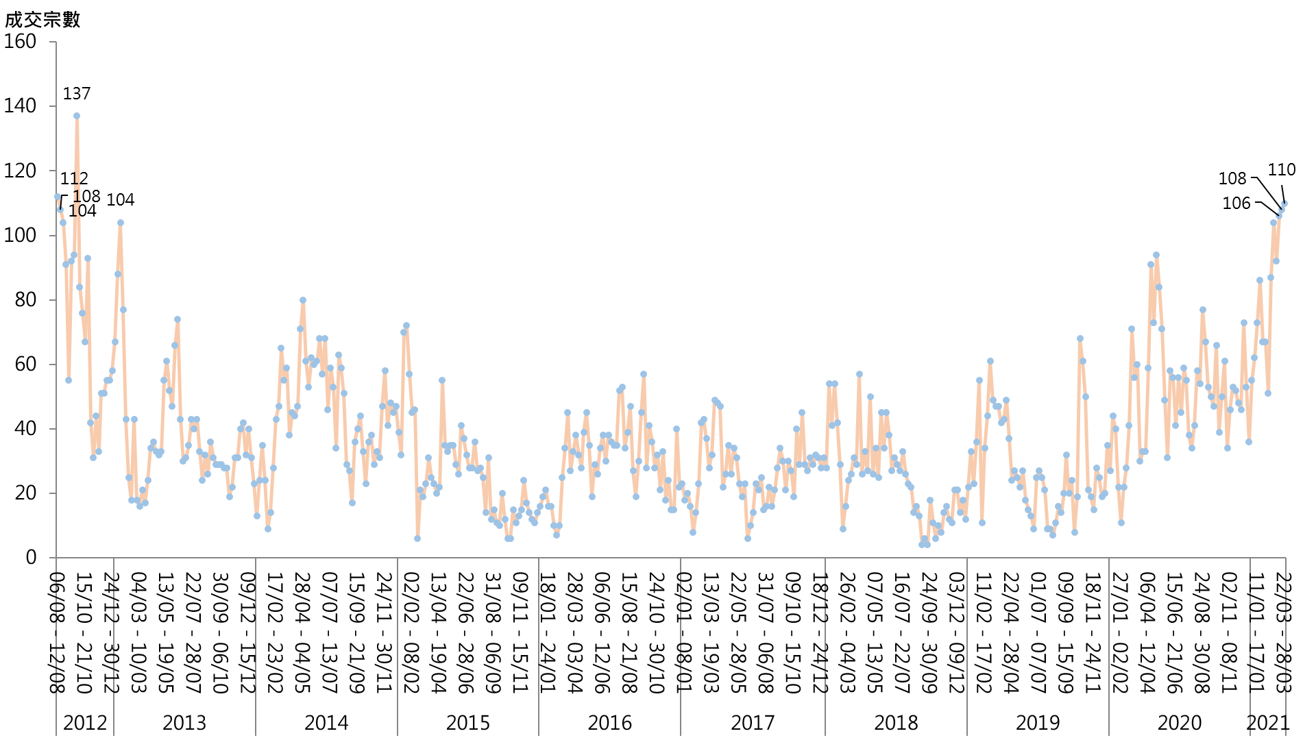 據本行前線分行所錄得的數字顯示,綜合過去一星期(3月22日至3月28日)全港20大主要屋苑二手買賣錄110宗成交,較前周(3月15日至3月21日)的108宗升約2%,再創逾8年新高,兼連續3周錄逾百宗水平,對上一次情況要去到2012年8月(見圖)。