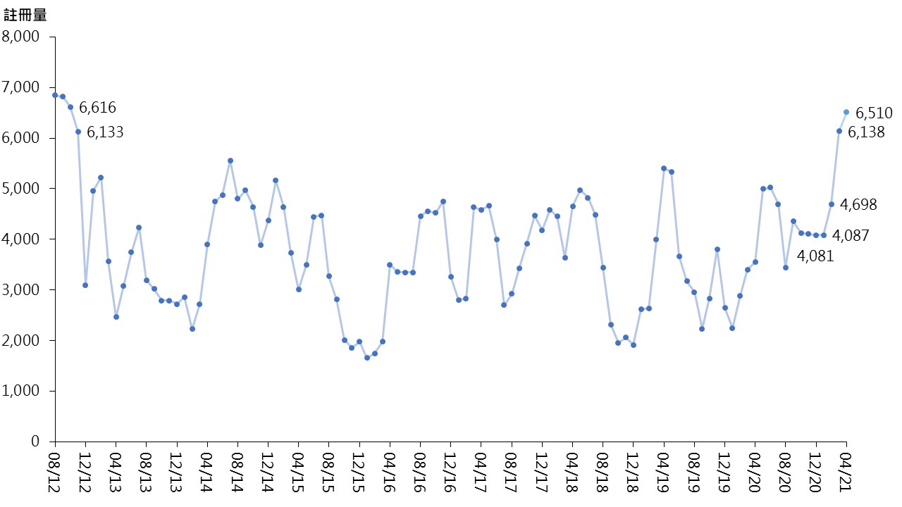 據土地註冊處資料顯示,二手住宅4月錄6,510宗註冊,較3月的6,138宗增加約6.1%,連升4個月,兼創近8年半新高(見圖)。鑑於簽署買賣合約至遞交到土地註冊處註冊登記需時,4月註冊個案一般主要反映3月市況。
