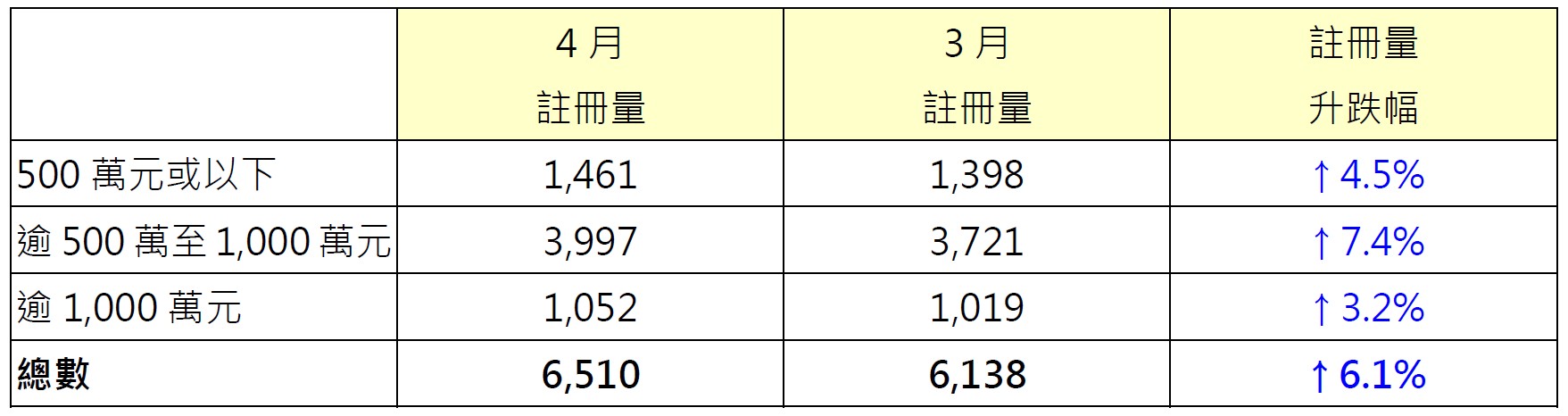 若按金額劃分4月二手住宅註冊量表現,當中價值500萬以上至1,000萬元二手住宅物業錄3,997宗註冊,較3月的3,721宗增加約7.4%;價值500萬元或以下二手住宅物業錄1,461宗註冊,較3月的1,398宗增加約4.5%;價值1,000萬元以上二手住宅物業錄1,052宗註冊,較3月的1,019宗增加約3.2%(見表)。