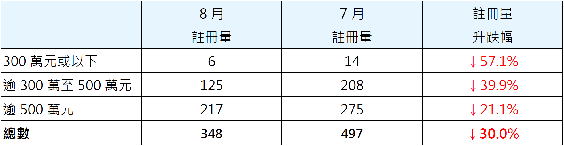 表一: 按金額劃分8月二手居屋註冊量與7月比較