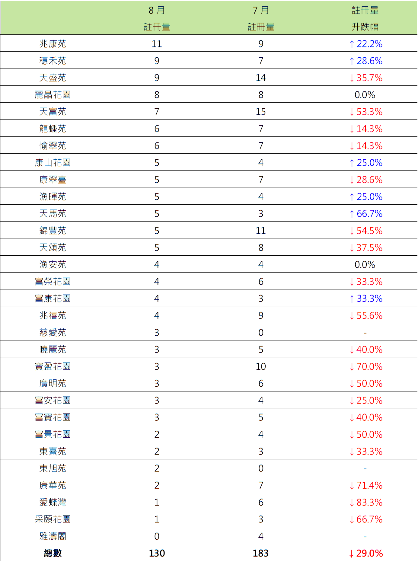 報升屋苑中,黃大仙天馬苑錄5宗註冊,較7月的3宗增加約66.7%;將軍澳富康花園錄4宗註冊,較7月的3宗增加約33.3%;火炭穗禾苑錄9宗註冊,較7月的7宗增加約28.6%。