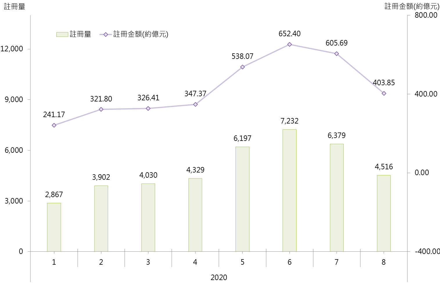 據土地註冊處最新資料顯示,8月錄4,516宗住宅物業註冊 (撇除一手公營房屋),較7月的6,379宗減少約29.2%;涉及註冊金額錄約403.85億元,較7月約605.69億元減少約33.3%;註冊量額同創近4個月新低 (見圖)。