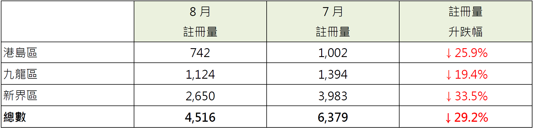 觀乎8月港島、九龍及新界各區住宅註冊量表現,當中新界區錄2,650宗註冊,較7月的3,983宗減少約33.5%;港島區錄742宗註冊,較7月的1,002宗減少約25.9%;九龍區錄1,124宗註冊,較7月的1,394宗減少約19.4% (見表)。