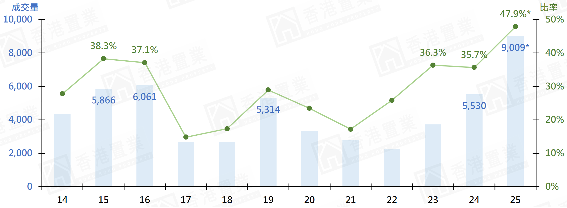 正因600萬元或以下一手成交量按年升幅勝大市,其佔整體一手成交量比率,由去年約35.7%,大增約12.2個百分點,至本年至今約47.9%,比率亦創自2013年一手銷售條例以來新高,逼近整體一手成交的一半(見圖),反映600萬元或以下的一手上車盤需求殷切。