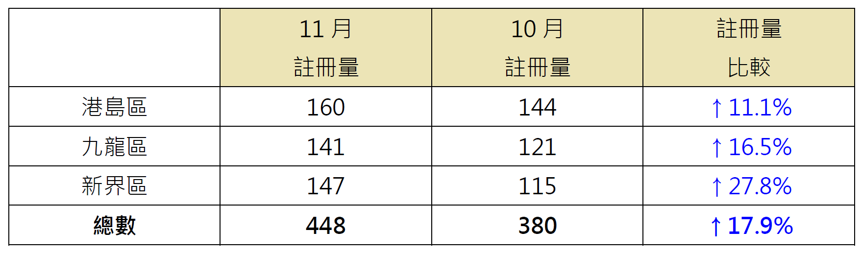 若以港島、九龍及新界三區劃分11月逾1,000萬元二手住宅註冊量按月表現,當中新界區升幅最大,錄147宗註冊,較10月的115宗增加約27.8%;九龍區錄141宗註冊,較10月的121宗增加約16.5%;港島區錄160宗註冊,三區中最多,較10月的144宗增加約11.1%(見表)。