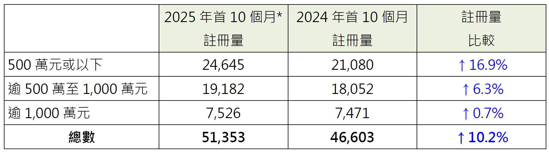 其他金額類別按年同期亦錄升幅,當中逾500萬至1,000萬元住宅物業錄19,182宗註冊,較去年同期的18,052宗增加約6.3%;而逾1,000萬元住宅物業錄7,526宗註冊,較去年同期的7,471宗則輕微增加約0.7%(見表)。