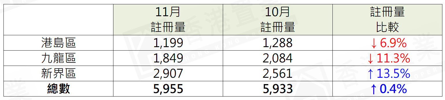 表:以三區劃分11月住宅物業註冊量