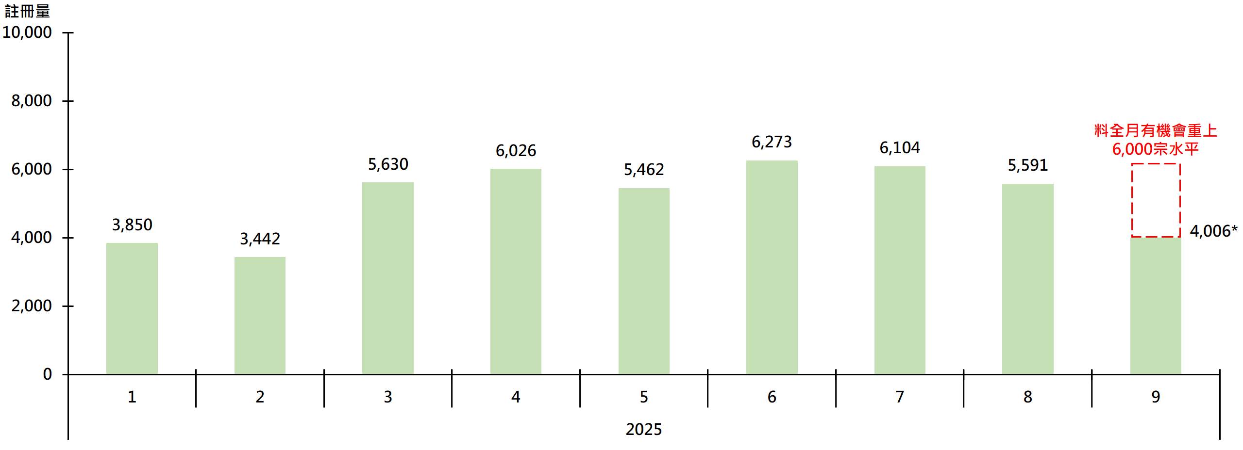 據土地註冊處最新資料顯示,本月至今(截至18日)住宅物業(包括一手私宅,二手私宅及二手公營房屋)錄4,006宗註冊,較上月同期的3,059宗增加約31%;若以目前註冊進度推算,料9月全月有機會重上6,000宗水平(見圖)。鑑於簽署買賣合約至遞交到土地註冊處註冊登記需時,9月註冊個案一般主要反映8月市況。本月美國重啟減息周期,香港銀行隨之減息,按揭息率下降,供樓負擔減輕,加上施政報告推出利好樓市措施,預期交投向好,估計主要反映9月市況的10月住宅物業註冊量有望進一步向上。