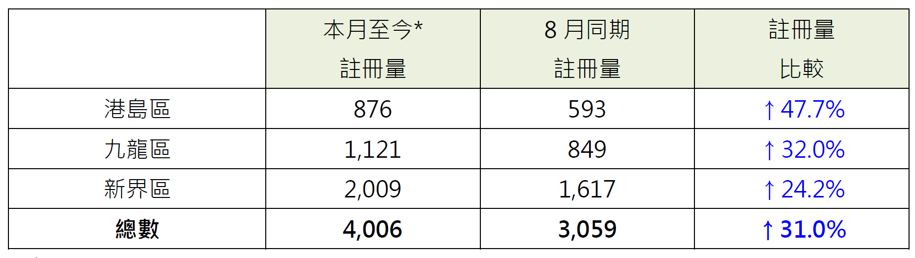 若以三區劃分本月至今住宅物業註冊量按月同期表現,當中新界區住宅物業錄2,009宗註冊,三區中最多,較上月同期的1,617宗增加約24.2%;九龍區住宅物業錄1,121宗註冊,較上月同期的849宗增加約32%;港島區住宅物業錄876宗註冊,較上月同期的593宗增加約47.7%,三區中升幅最為顯著(見表)。