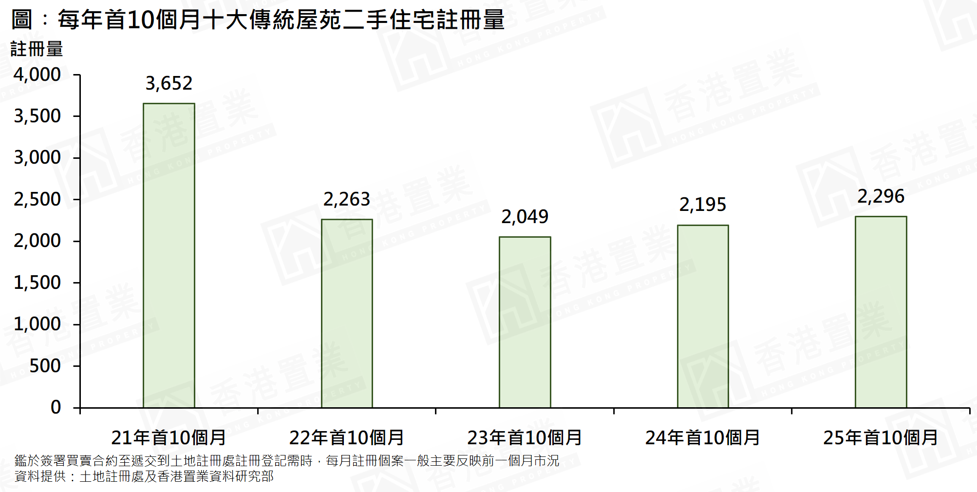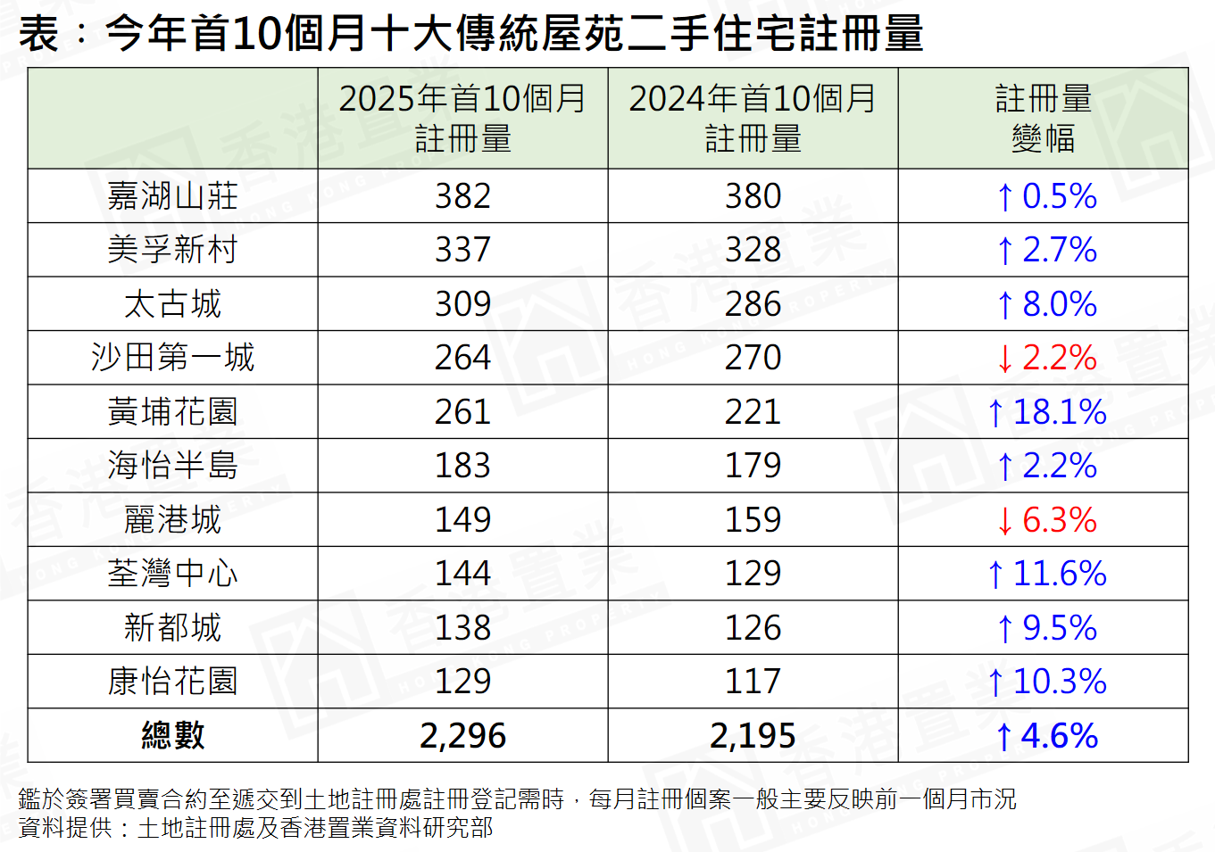 據土地註冊處資料顯示,十大傳統屋苑今年首10個月錄2,296宗註冊,較去年首10個月的2,195宗增加約4.6%,創4年同期新高(見圖)。
