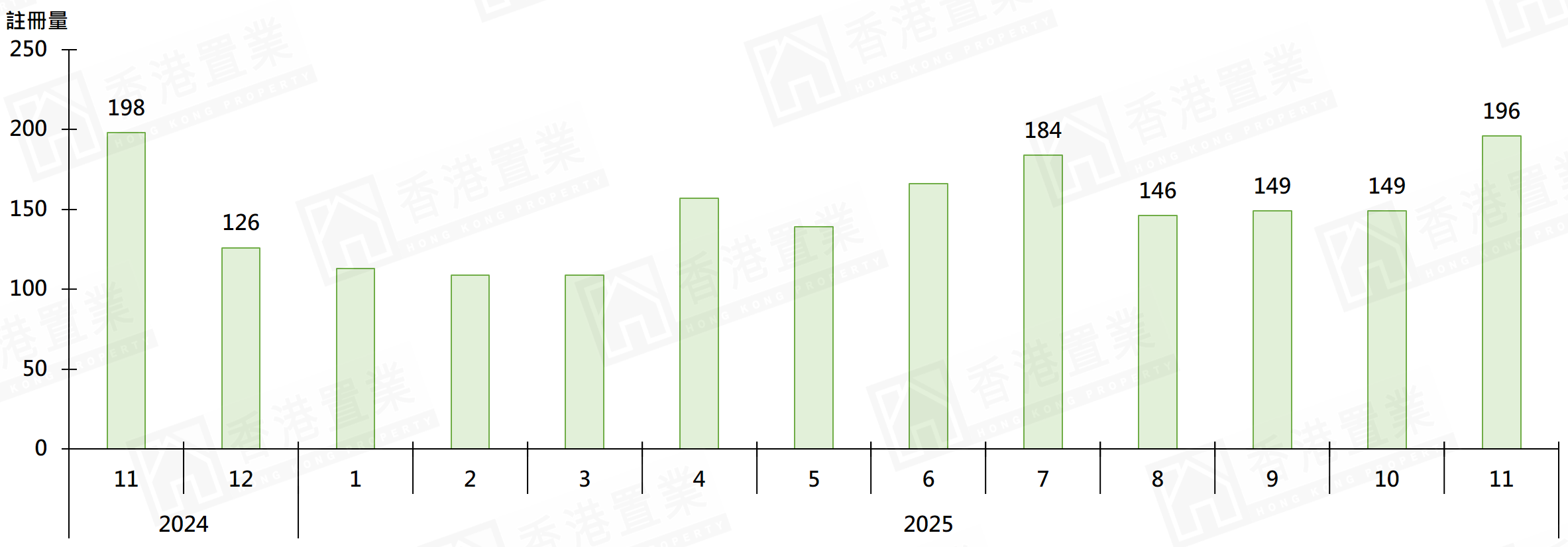 據土地註冊處資料顯示,11月二手住宅(包括二手私人住宅及二手公營房屋)錄4,164宗註冊,較10月的3,905宗增加約6.6%;當中本行選取的將軍澳區30個私人屋苑11月錄196宗註冊,較10月的149宗增加約31.5%,按月表現勝大市,兼創1年新高(見圖)。鑑於簽署買賣合約至遞交到土地註冊處註冊登記需時,11月註冊個案一般主要反映10月市況。