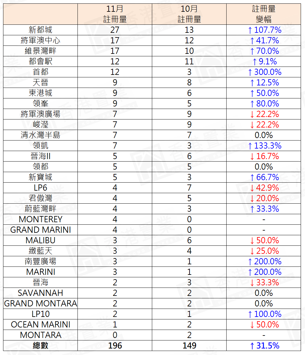 至於11月將軍澳區30個私人屋苑二手住宅註冊量排名方面,新都城以27宗註冊居榜首,較10月的13宗大增近1.1倍;將軍澳中心及維景灣畔各以17宗二手住宅註冊並列第二,其中將軍澳中心較10月的12宗增加約41.7%,維景灣畔較10月的10宗更增加70%(見表)。