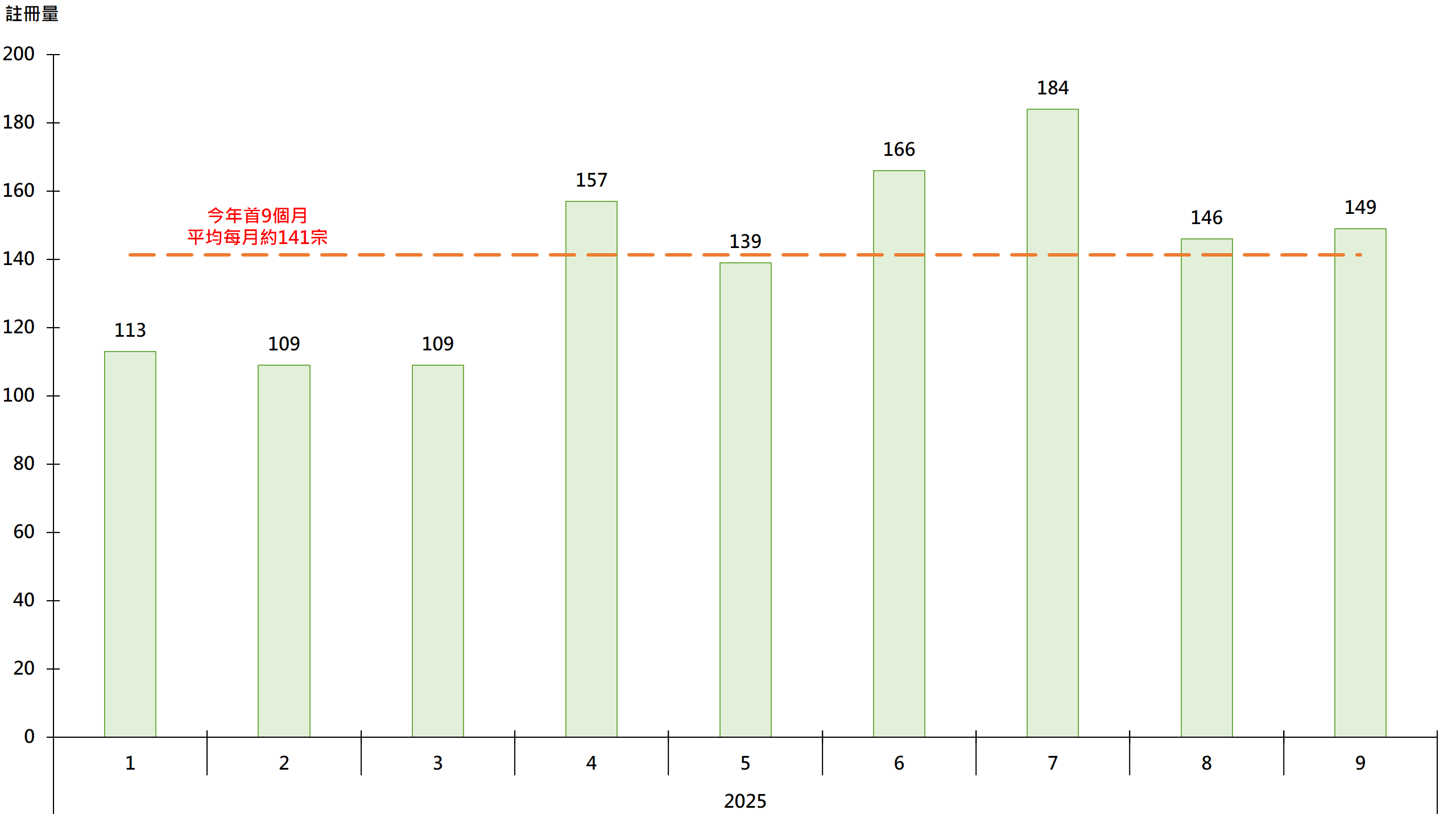 據土地註冊處資料顯示,本行選取的將軍澳區30個私人屋苑9月錄149宗二手住宅註冊,較8月的146宗輕微回升約2.1%,亦繼續穩企今年首9個月平均每月約141宗水平之上(見圖)。鑑於簽署買賣合約至遞交到土地註冊處註冊登記需時,9月註冊個案一般主要反映8月市況。