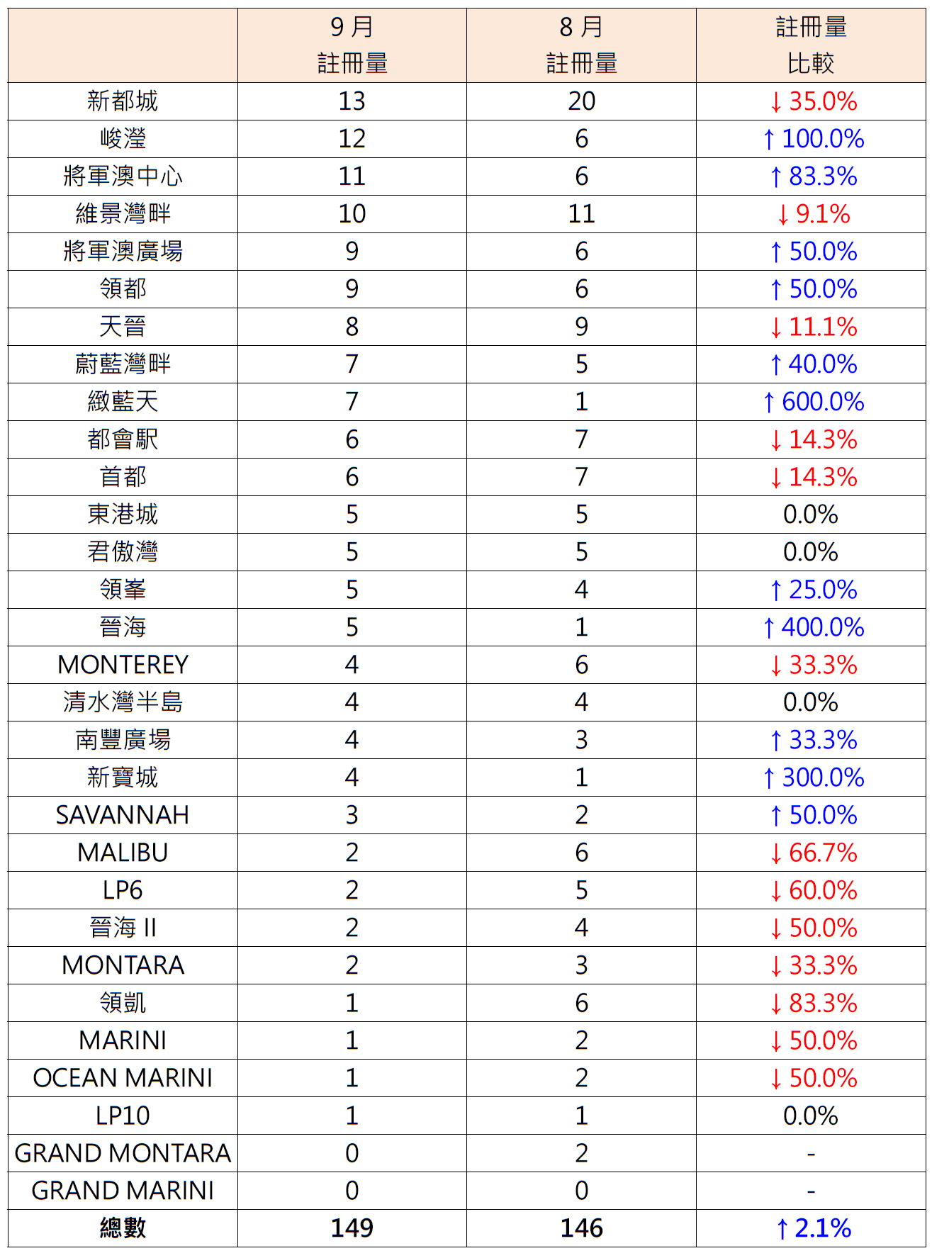 9月將軍澳區30個私人屋苑中,有11個屋苑二手住宅註冊量按月報升;當中緻藍天錄7宗註冊,較8月的1宗增加6倍;晉海錄5宗註冊,較8月的1宗增加4倍;新寶城錄4宗註冊,較8月的1宗增加3倍。