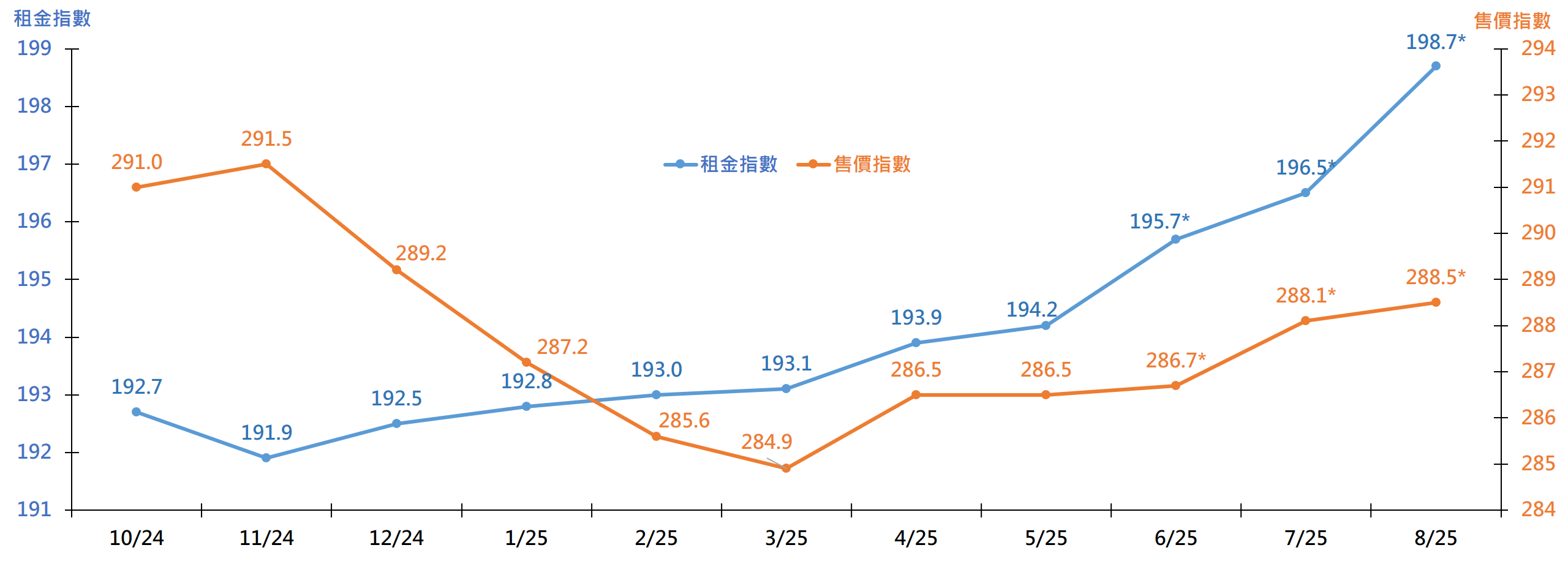 圖︰每月差估署私人住宅售價及租金指數