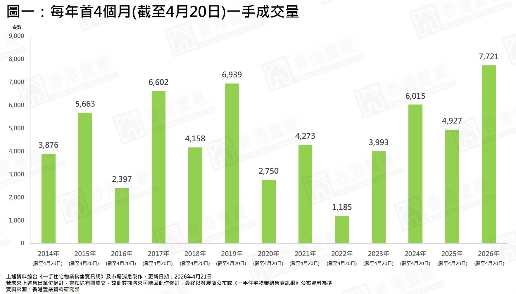 今年新盤市場交投暢旺,據香港置業資料研究部綜合《一手住宅物業銷售資訊網》資料及市場消息,本年首4個月(截至4月20日)一手成交錄7,721宗,較去年同期(同樣截至4月20日)4,927宗大幅上升約56.7%,不單超越2019年同期高位6,939宗,更創2013年一手銷售條例以來的同期新高(見圖一)。若以去年全年逾2萬宗的一手成交新高作比較,今年不足4個月的成交量已達去年全年逾38%,顯示今年一手市場交投明顯較去年活躍。