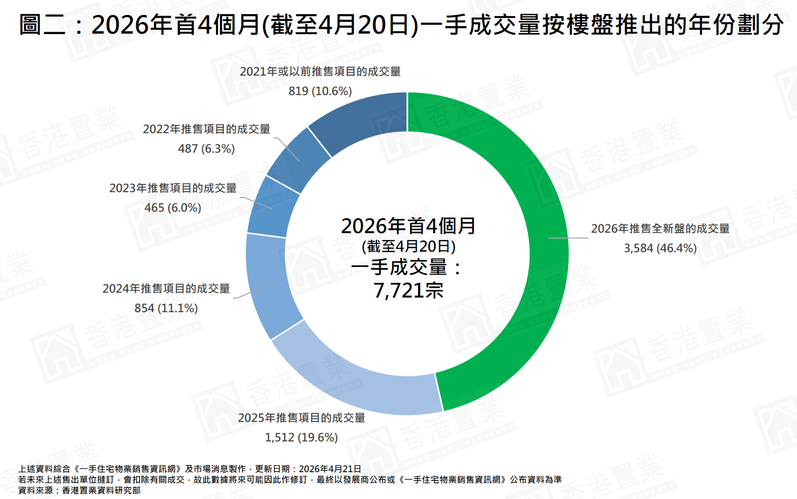 若將本年首4個月(截至4月20日)一手成交量按樓盤推出年份劃分,今年推出全新盤的成交量錄3,584宗,佔約46.4%,交投主要來自SIERRA SEA第2A及2B期,海瑅灣、雲向、首匯等;其餘約53.6%(4,137宗)屬於2025年或以前推售項目的成交,反映貨尾盤成交量比全新盤更多(見圖二)。