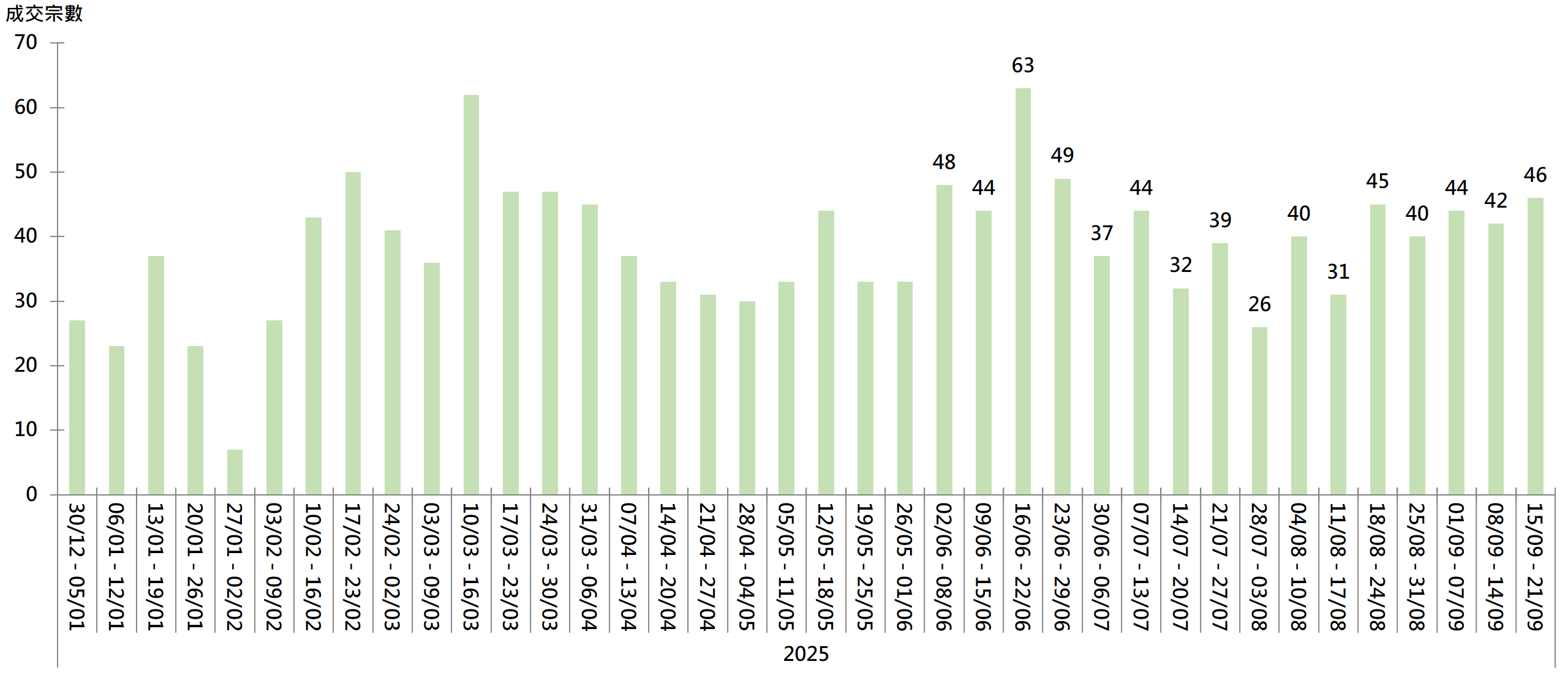 新一份《施政報告》推出利好樓市措施,再加上美聯儲重啟減息周期,有利市場氣氛,當中上周一手交投表現理想,更有全新盤首輪價單推售115伙即日沽清,一手表現熾熱;與此同時,上周二手交投按周同樣向上。據本行前線分行所錄得的數字顯示,綜合過去一星期(9月15日至9月21日)全港20大主要屋苑二手買賣錄46宗成交,較前周(9月8日至9月14日)的42宗增加約9.5%,更創12周新高(見圖)。