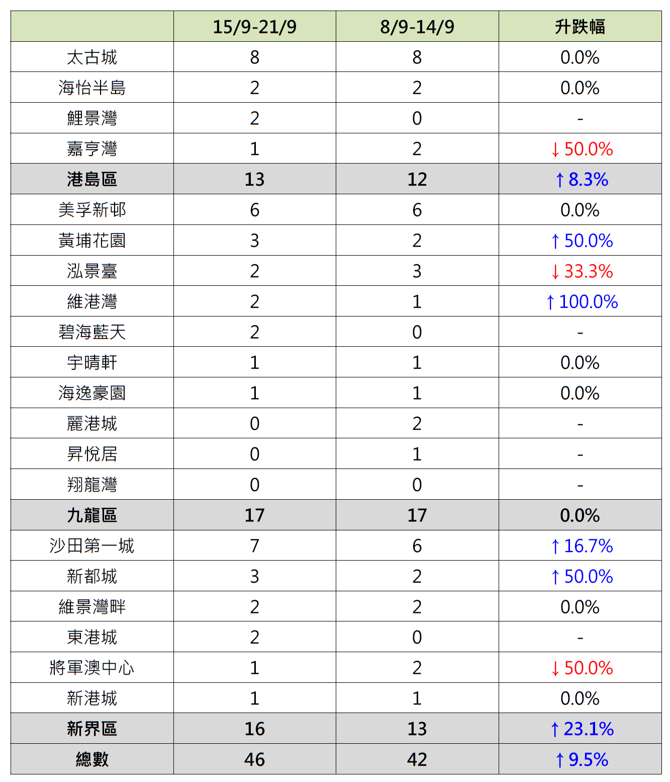若以港島、九龍及新界三區劃分20大屋苑上周成交表現,其中港島區4個指標屋苑上周錄13宗成交,較前周的12宗增加約8.3%;當中鯉景灣「破蛋」,按周增加2宗成交,帶動該區成交按周錄升;相反,嘉亨灣錄1宗成交,較前周的2宗減少50%;而太古城及海怡半島分別錄得8宗及2宗成交,同樣按周持平。