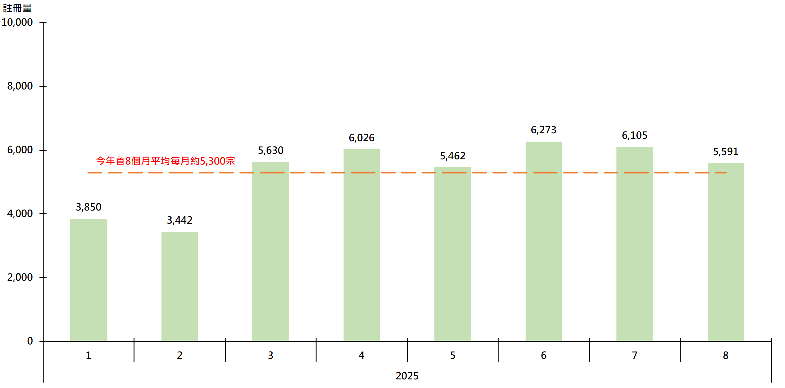 據土地註冊處最新資料顯示,8月住宅物業(包括一手私宅,二手私宅及二手公營房屋)錄5,591宗註冊,雖較7月的6,105宗減少約8.4%,惟仍高於今年首8個月平均每月約5,300宗(見圖)。鑑於簽署買賣合約至遞交到土地註冊處註冊登記需時,8月註冊個案一般主要反映7月市況。