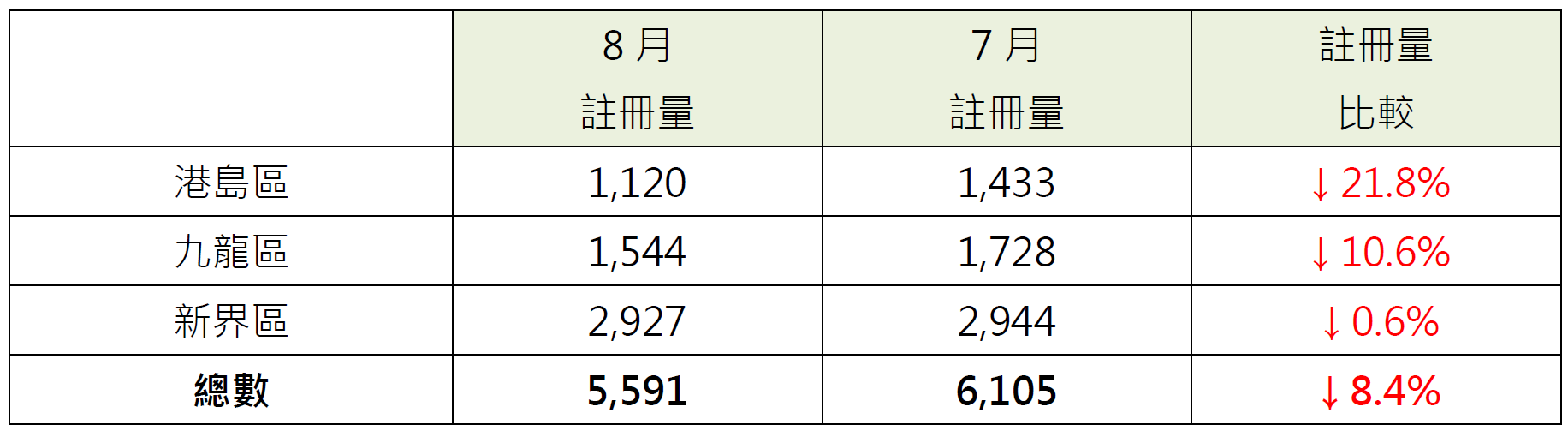 若以三區劃分8月住宅物業註冊量按月表現,當中新界區住宅物業錄2,927宗註冊,較7月的2,944宗輕微減少約0.6%;九龍區住宅物業錄1,544宗註冊,較7月的1,728宗減少約10.6%;港島區住宅物業錄1,120宗註冊,較7月的1,433宗減少約21.8%(見表)。