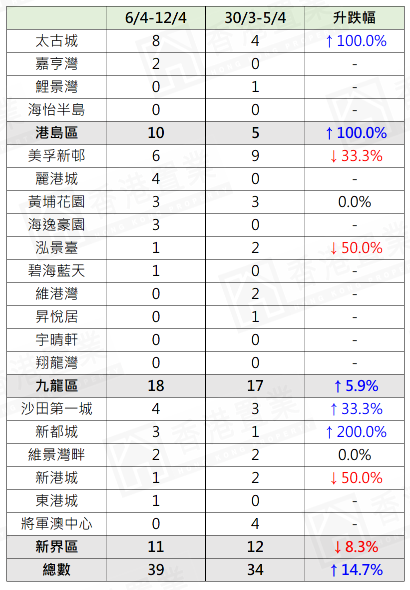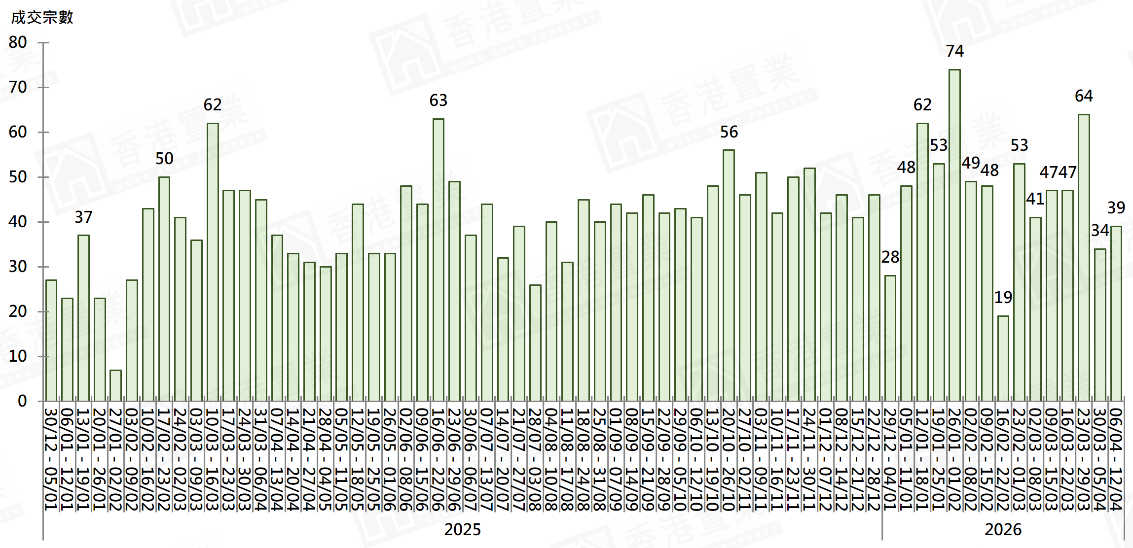 據本行前線分行所錄得的數字顯示,綜合過去一星期(4月6日至4月12日)全港20大主要屋苑二手買賣錄39宗成交,較前周(3月30日至4月5日)的34宗增加約14.7%(圖)。