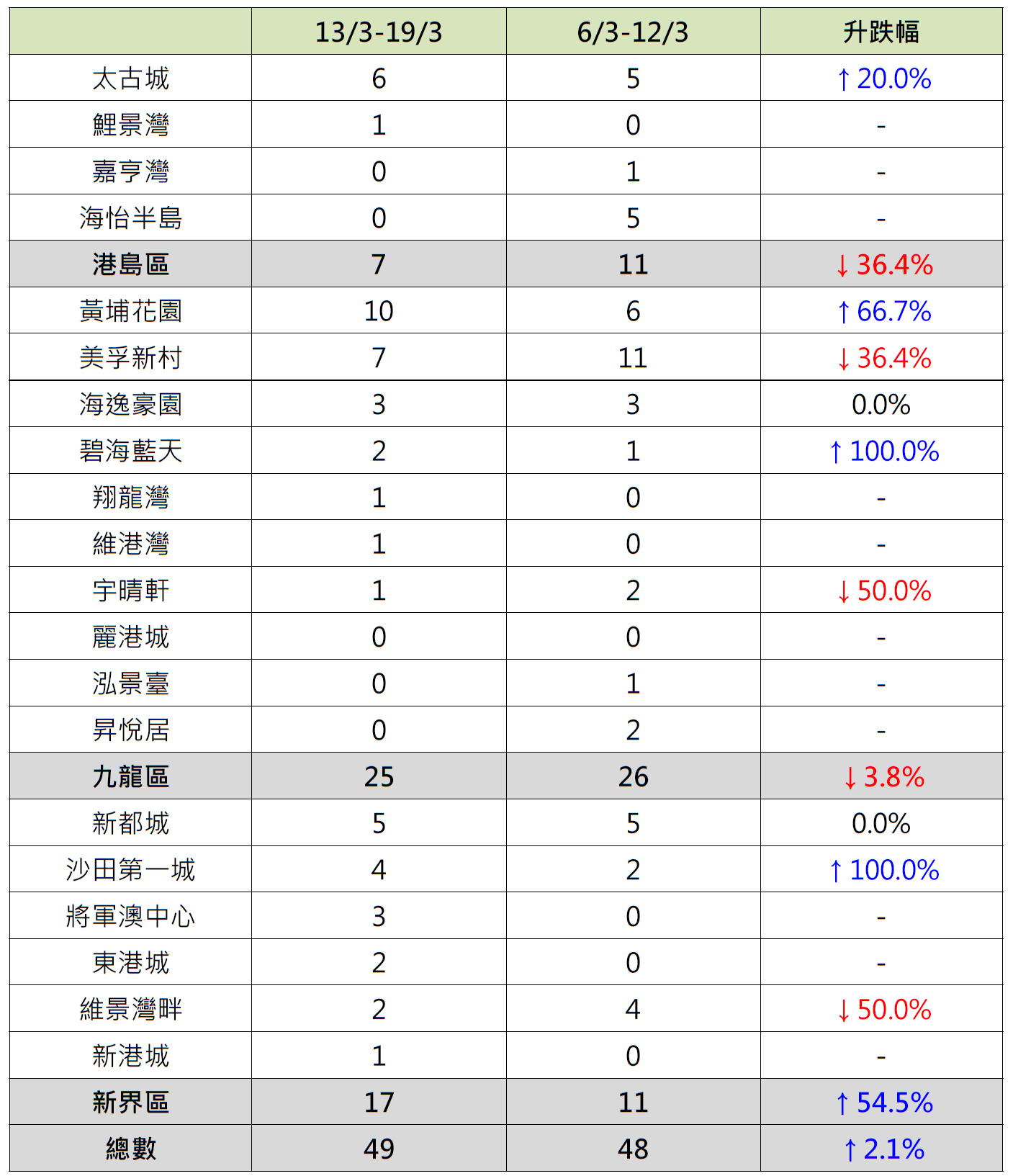 觀乎上周港島、九龍及新界三區屋苑二手交投表現,其中新界區6個指標屋苑上周錄17宗成交,按周增加約54.5%,帶動全港20大屋苑二手成交按周向上;當中沙田第一城錄4宗成交,按周增加1倍;新港城、東港城及將軍澳中心齊「破蛋」,按周分別增加1宗、2宗及3宗成交;相反,維景灣畔錄2宗成交,按周減少50%。